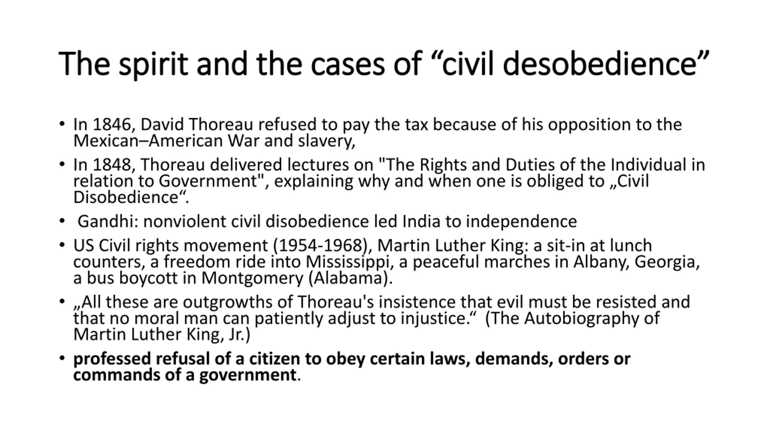 The The spirit spirit and and the the c cases ases of civil of civil desobedience desobedience In 1846, David Thoreau refused to pay the tax because of his opposition to the Mexican American War and slavery, In 1848, Thoreau delivered lectures on "The Rights and Duties of the Individual in relation to Government", explaining why and when one is obliged to Civil Disobedience . Gandhi: nonviolent civil disobedience led India to independence US Civil rights movement (1954-1968), Martin Luther King: a sit-in at lunch counters, a freedom ride into Mississippi, a peaceful marches in Albany, Georgia, a bus boycott in Montgomery (Alabama). All these are outgrowths of Thoreau's insistence that evil must be resisted and that no moral man can patiently adjust to injustice. (The Autobiography of Martin Luther King, Jr.) professed refusal of a citizen to obey certain laws, demands, orders or commands of a government.