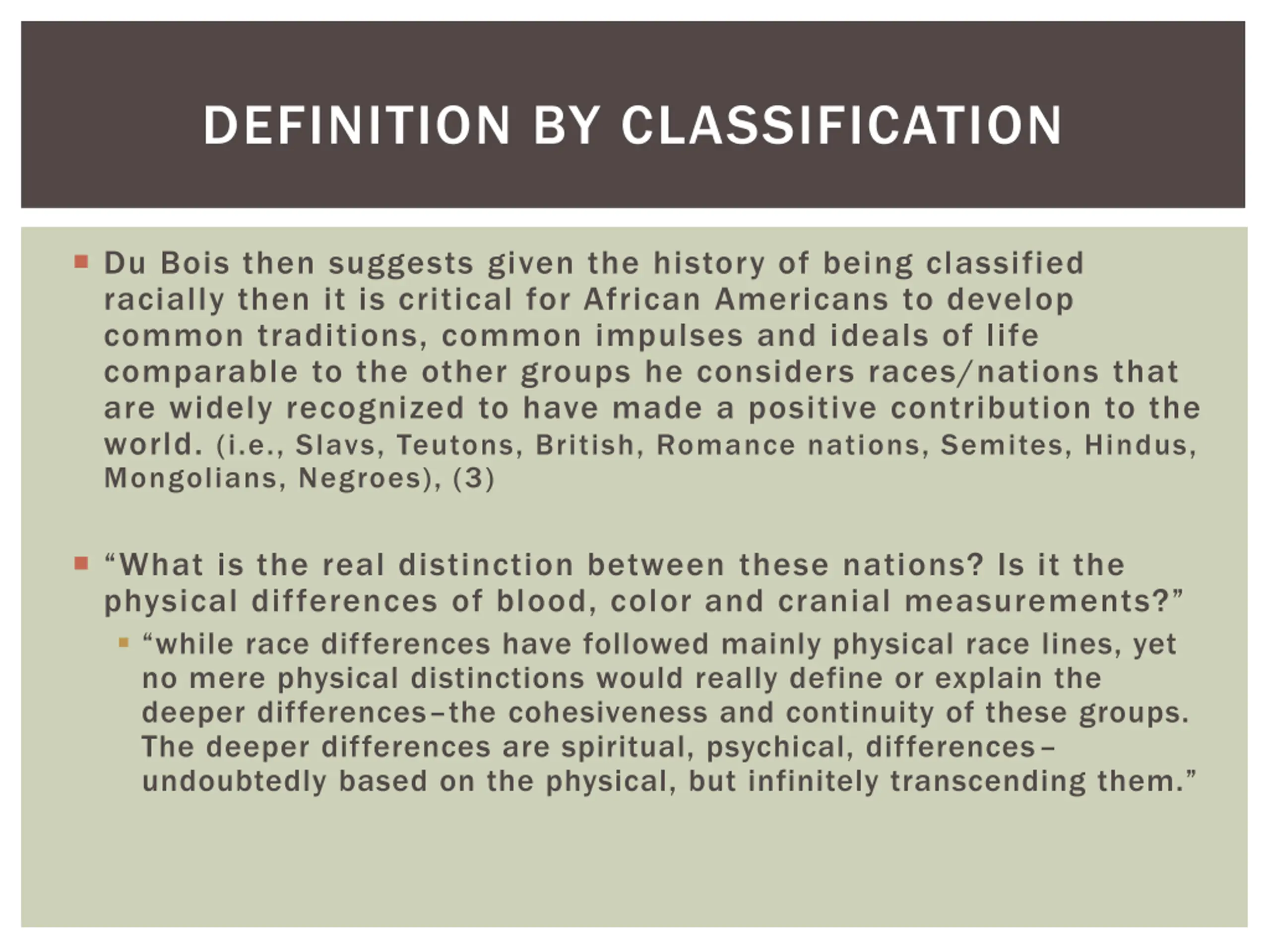 DEFINITION BY CLASSIFICATION Du Bois then suggests given the history of being classified racially then it is critical for African Americans to develop common traditions, common impulses and ideals of life comparable to the other groups he considers races/nations that are widely recognized to have made a positive contribution to the world. (i.e., Slavs, Teutons, British, Romance nations, Semites, Hindus, Mongolians, Negroes), (3) What is the real distinction between these nations? Is it the physical differences of blood, color and cranial measurements? while race differences have followed mainly physical race lines, yet no mere physical distinctions would really define or explain the deeper differences the cohesiveness and continuity of these groups. The deeper differences are spiritual, psychical, differences undoubtedly based on the physical, but infinitely transcending them.