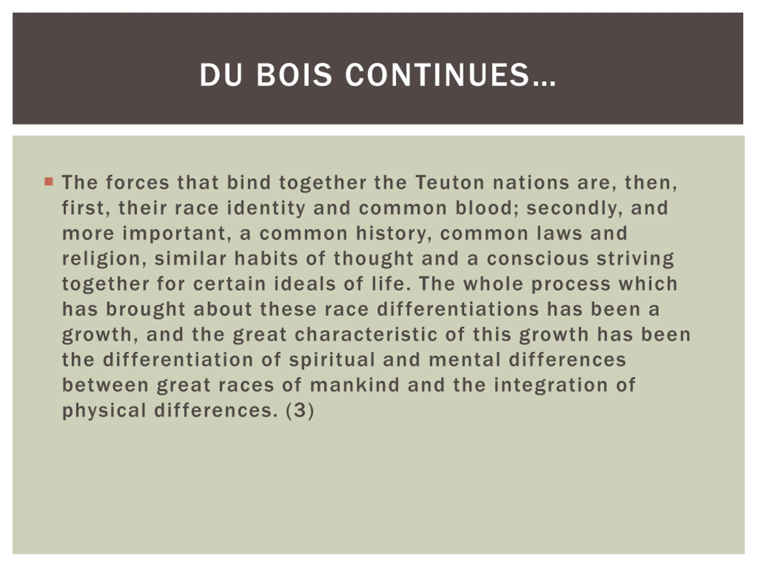 DU BOIS CONTINUES The forces that bind together the Teuton nations are, then, first, their race identity and common blood; secondly, and more important, a common history, common laws and religion, similar habits of thought and a conscious striving together for certain ideals of life. The whole process which has brought about these race differentiations has been a growth, and the great characteristic of this growth has been the differentiation of spiritual and mental differences between great races of mankind and the integration of physical differences. (3)