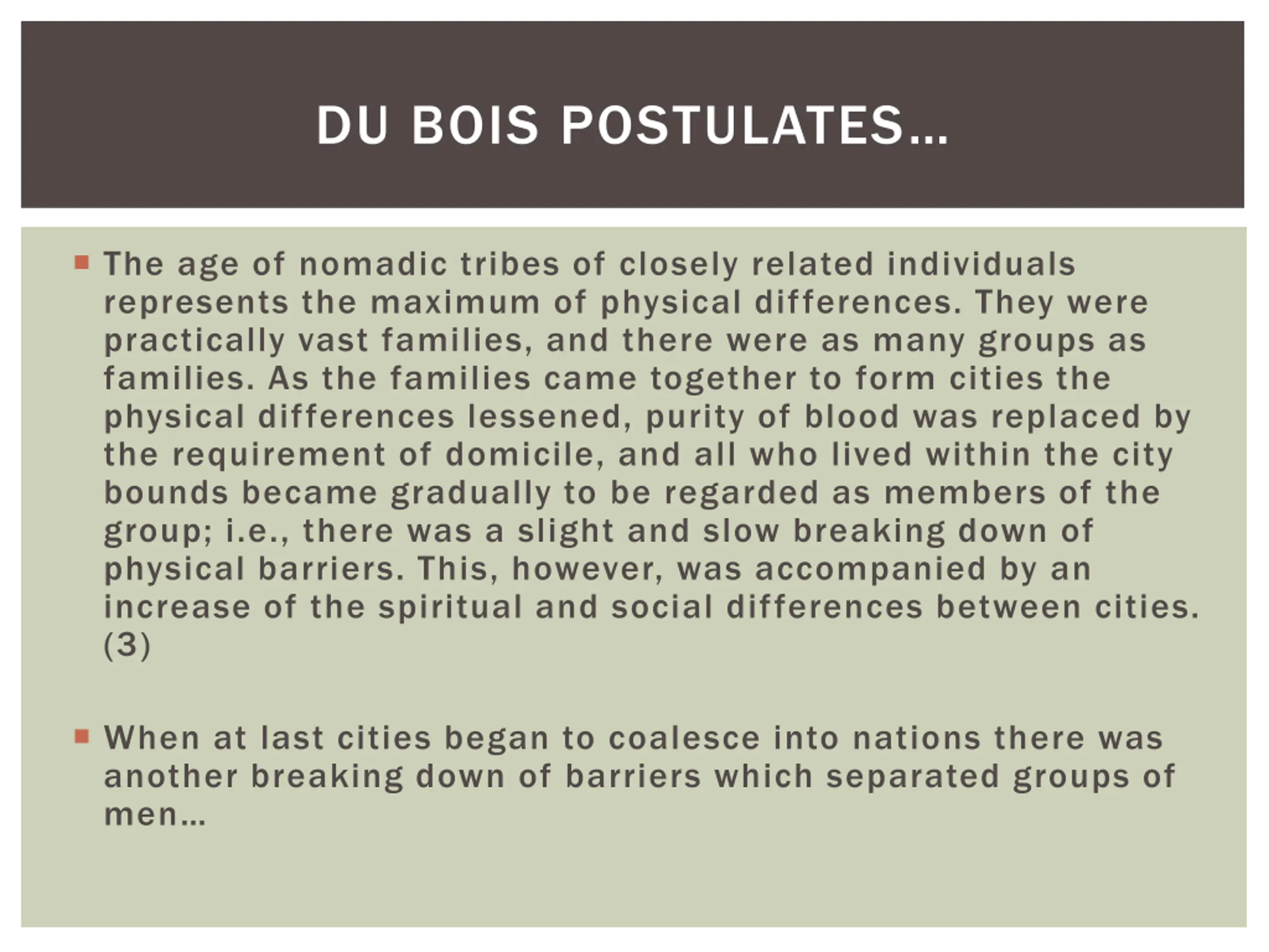DU BOIS POSTULATES The age of nomadic tribes of closely related individuals represents the maximum of physical differences. They were practically vast families, and there were as many groups as families. As the families came together to form cities the physical differences lessened, purity of blood was replaced by the requirement of domicile, and all who lived within the city bounds became gradually to be regarded as members of the group; i.e., there was a slight and slow breaking down of physical barriers. This, however, was accompanied by an increase of the spiritual and social differences between cities. (3) When at last cities began to coalesce into nations there was another breaking down of barriers which separated groups of men