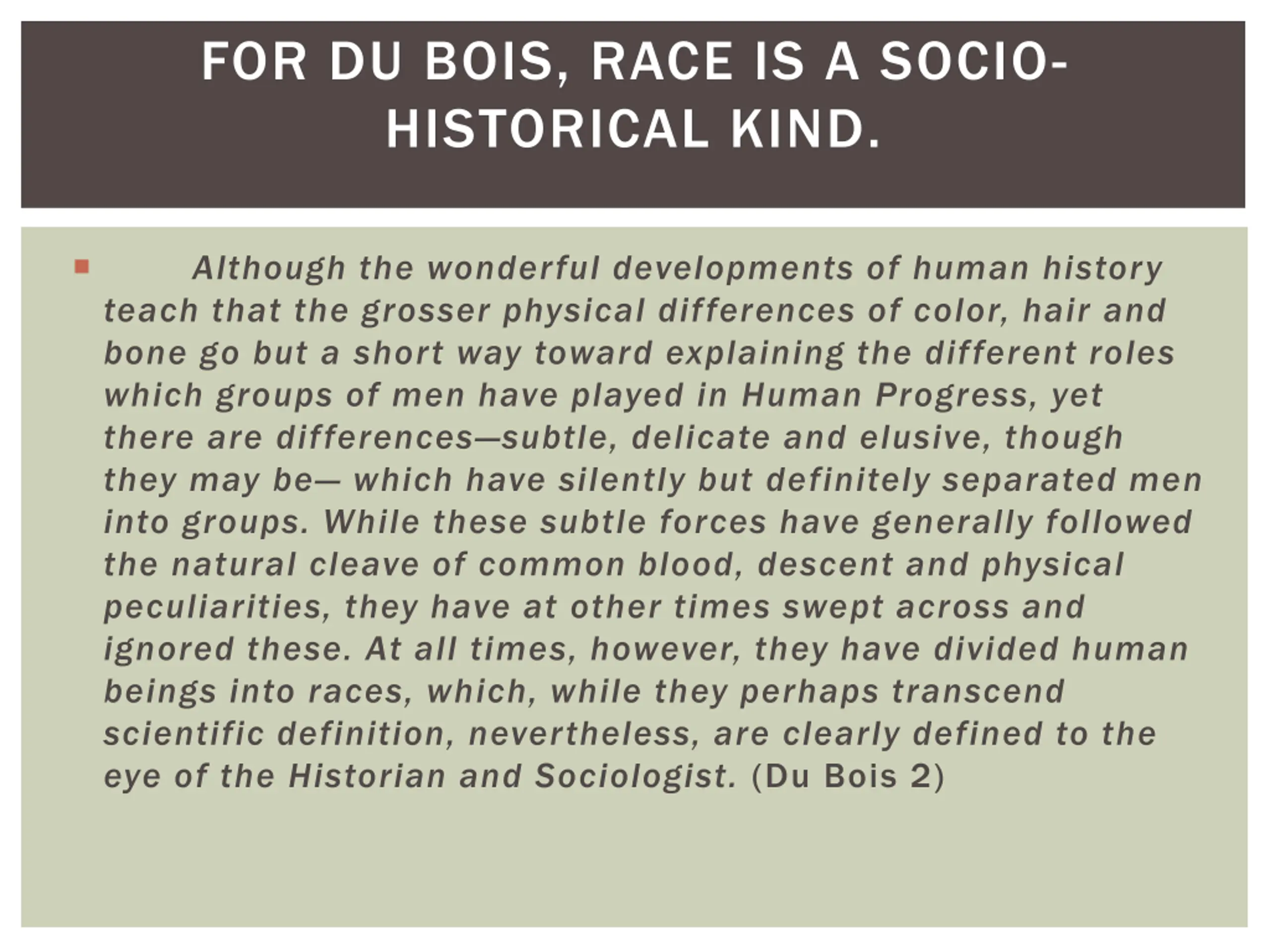 FOR DU BOIS, RACE IS A SOCIO- HISTORICAL KIND. Although the wonderful developments of human history teach that the grosser physical differences of color, hair and bone go but a short way toward explaining the different roles which groups of men have played in Human Progress, yet there are differences subtle, delicate and elusive, though they may be which have silently but definitely separated men into groups. While these subtle forces have generally followed the natural cleave of common blood, descent and physical peculiarities, they have at other times swept across and ignored these. At all times, however, they have divided human beings into races, which, while they perhaps transcend scientific definition, nevertheless, are clearly defined to the eye of the Historian and Sociologist. (Du Bois 2)