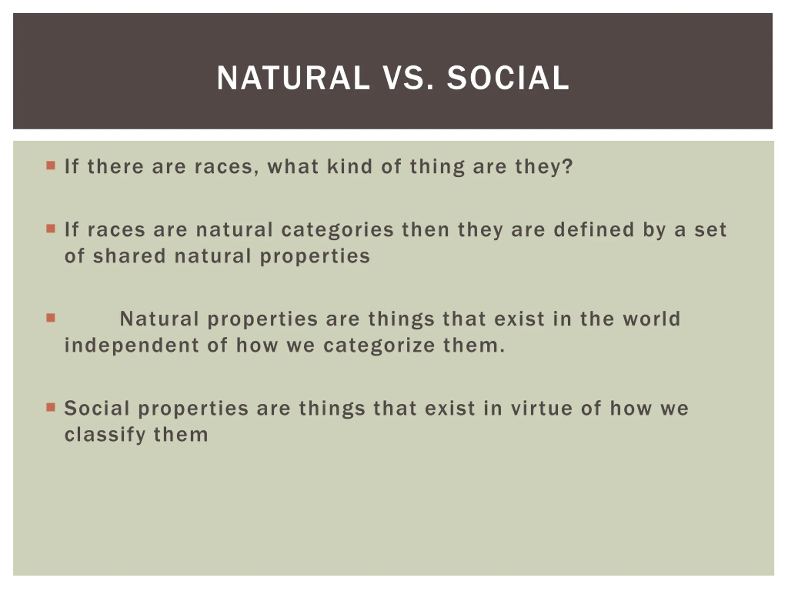 NATURAL VS. SOCIAL If there are races, what kind of thing are they? If races are natural categories then they are defined by a set of shared natural properties Natural properties are things that exist in the world independent of how we categorize them. Social properties are things that exist in virtue of how we classify them