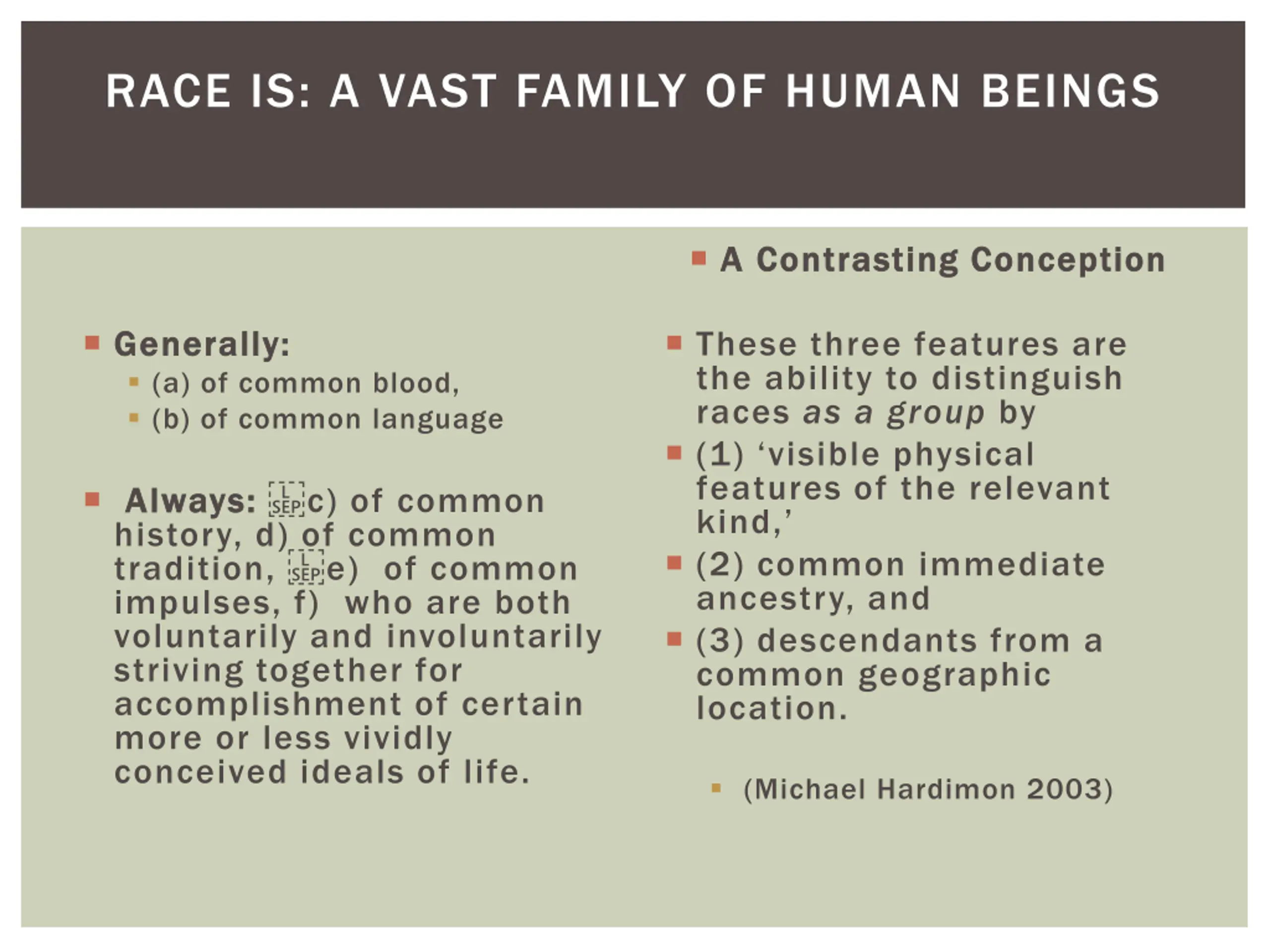 RACE IS: A VAST FAMILY OF HUMAN BEINGS A Contrasting Conception A Contrasting Conception Generally: Generally: (a) of common blood, (b) of common language These three features are the ability to distinguish races as a group by (1) visible physical features of the relevant kind, (2) common immediate ancestry, and (3) descendants from a common geographic location. Always: Always: c) of common history, d) of common tradition, e) of common impulses, f) who are both voluntarily and involuntarily striving together for accomplishment of certain more or less vividly conceived ideals of life. (Michael Hardimon 2003)