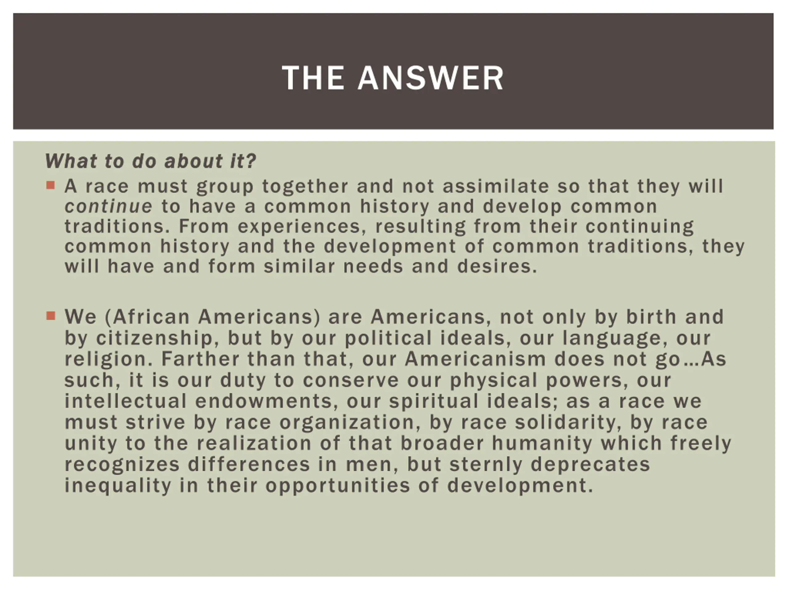 THE ANSWER What to do about it? What to do about it? A race must group together and not assimilate so that they will continue to have a common history and develop common traditions. From experiences, resulting from their continuing common history and the development of common traditions, they will have and form similar needs and desires. We (African Americans) are Americans, not only by birth and by citizenship, but by our political ideals, our language, our religion. Farther than that, our Americanism does not go As such, it is our duty to conserve our physical powers, our intellectual endowments, our spiritual ideals; as a race we must strive by race organization, by race solidarity, by race unity to the realization of that broader humanity which freely recognizes differences in men, but sternly deprecates inequality in their opportunities of development.