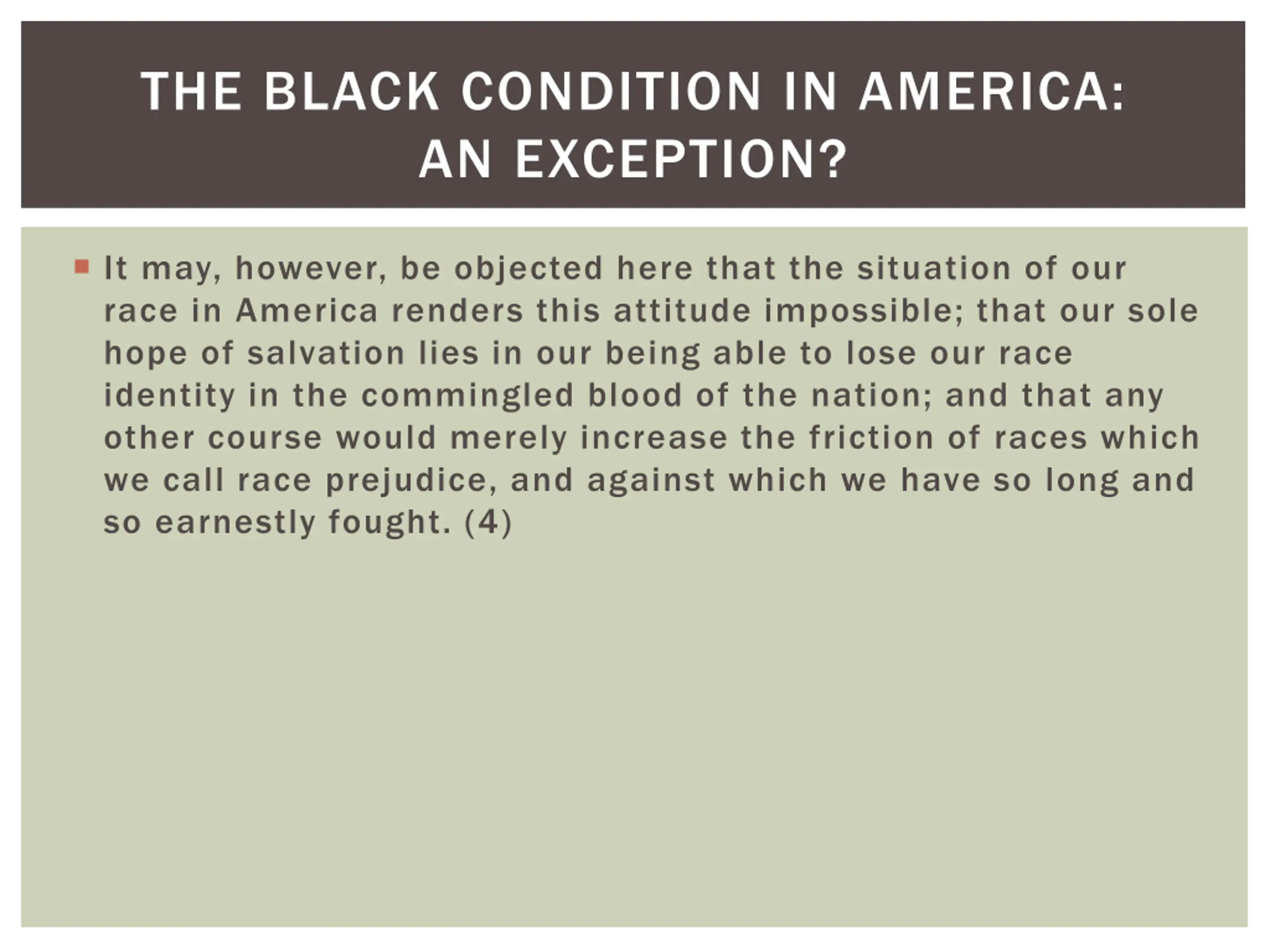 THE BLACK CONDITION IN AMERICA: AN EXCEPTION? It may, however, be objected here that the situation of our race in America renders this attitude impossible; that our sole hope of salvation lies in our being able to lose our race identity in the commingled blood of the nation; and that any other course would merely increase the friction of races which we call race prejudice, and against which we have so long and so earnestly fought. (4)