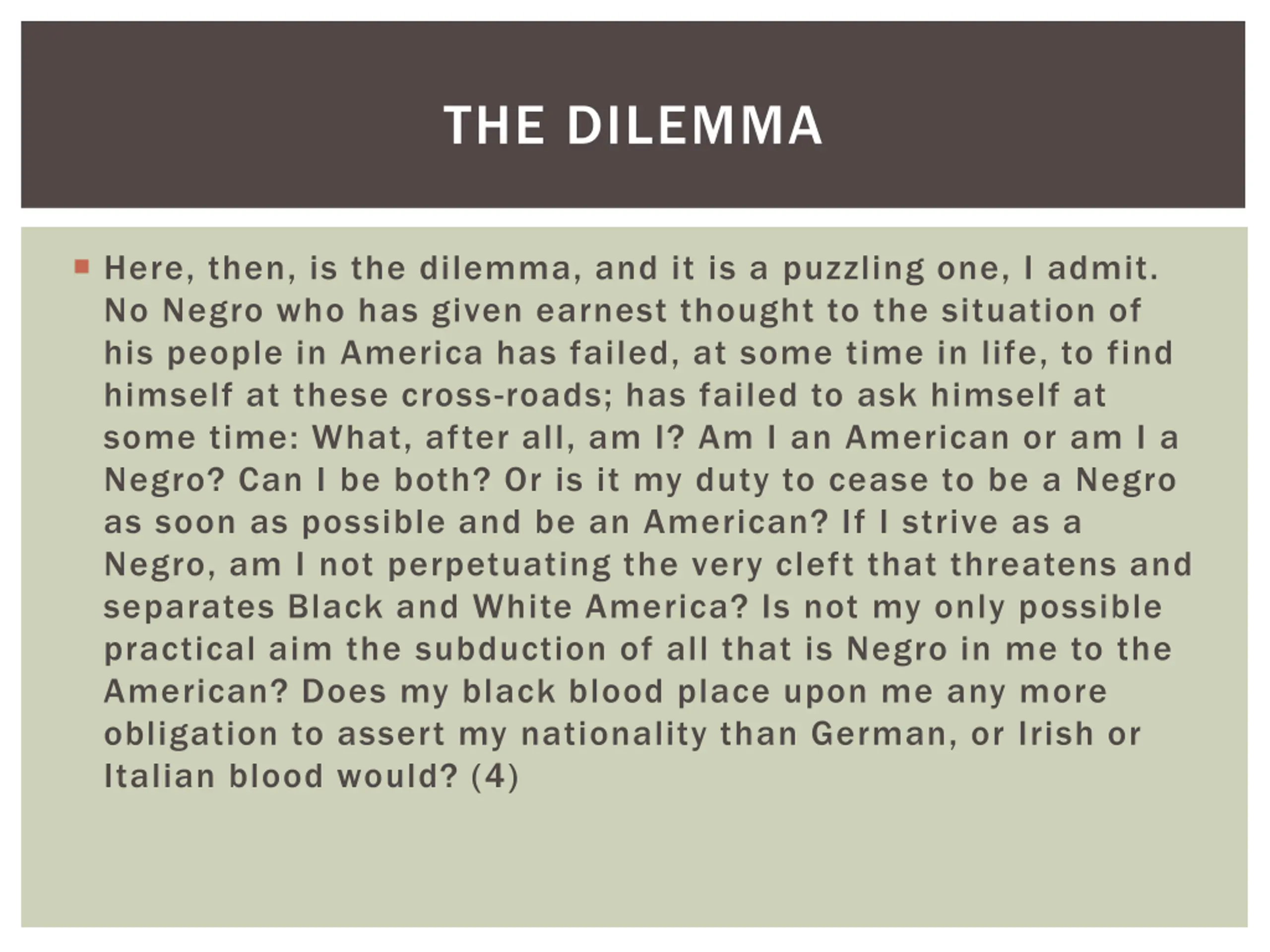 THE DILEMMA Here, then, is the dilemma, and it is a puzzling one, I admit. No Negro who has given earnest thought to the situation of his people in America has failed, at some time in life, to find himself at these cross-roads; has failed to ask himself at some time: What, after all, am I? Am I an American or am I a Negro? Can I be both? Or is it my duty to cease to be a Negro as soon as possible and be an American? If I strive as a Negro, am I not perpetuating the very cleft that threatens and separates Black and White America? Is not my only possible practical aim the subduction of all that is Negro in me to the American? Does my black blood place upon me any more obligation to assert my nationality than German, or Irish or Italian blood would? (4)