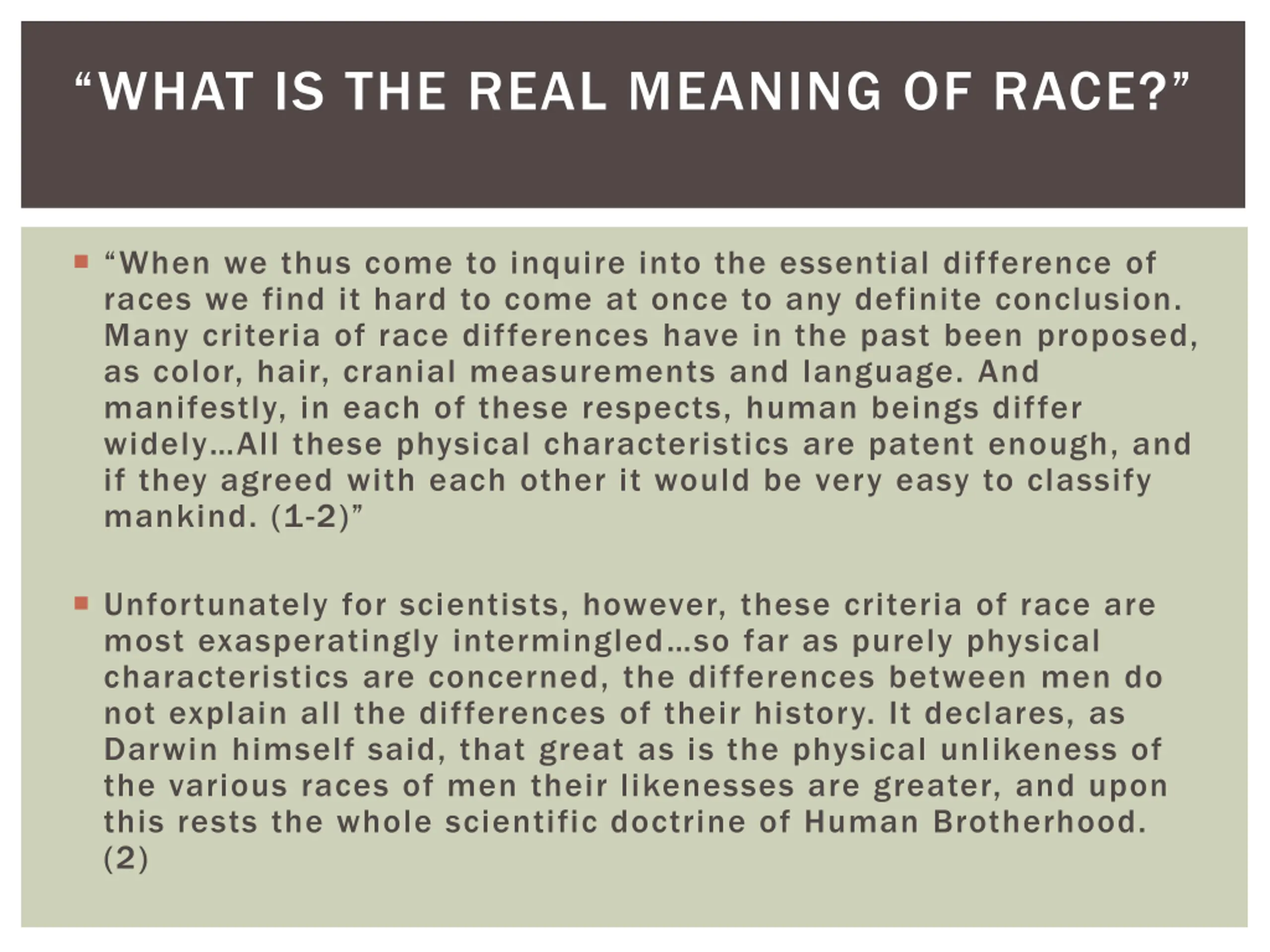 WHAT IS THE REAL MEANING OF RACE? When we thus come to inquire into the essential difference of races we find it hard to come at once to any definite conclusion. Many criteria of race differences have in the past been proposed, as color, hair, cranial measurements and language. And manifestly, in each of these respects, human beings differ widely All these physical characteristics are patent enough, and if they agreed with each other it would be very easy to classify mankind. (1-2) Unfortunately for scientists, however, these criteria of race are most exasperatingly intermingled so far as purely physical characteristics are concerned, the differences between men do not explain all the differences of their history. It declares, as Darwin himself said, that great as is the physical unlikeness of the various races of men their likenesses are greater, and upon this rests the whole scientific doctrine of Human Brotherhood. (2)