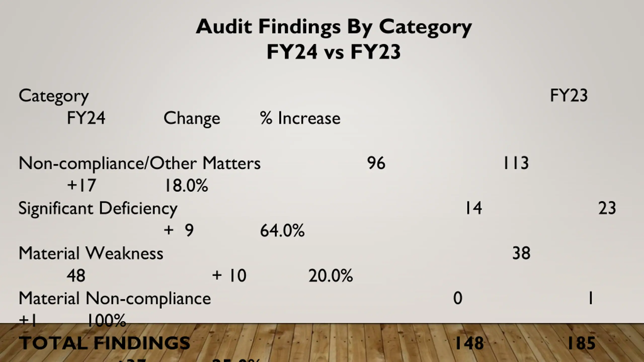 Audit Findings By Category FY24 vs FY23 Category FY23 FY24 Change % Increase Non-compliance/Other Matters +17 Significant Deficiency 96 113 18.0% 14 23 + 9 64.0% Material Weakness 48 Material Non-compliance +1 100% TOTAL FINDINGS 38 + 10 20.0% 0 1 148 185 +37 25.0%