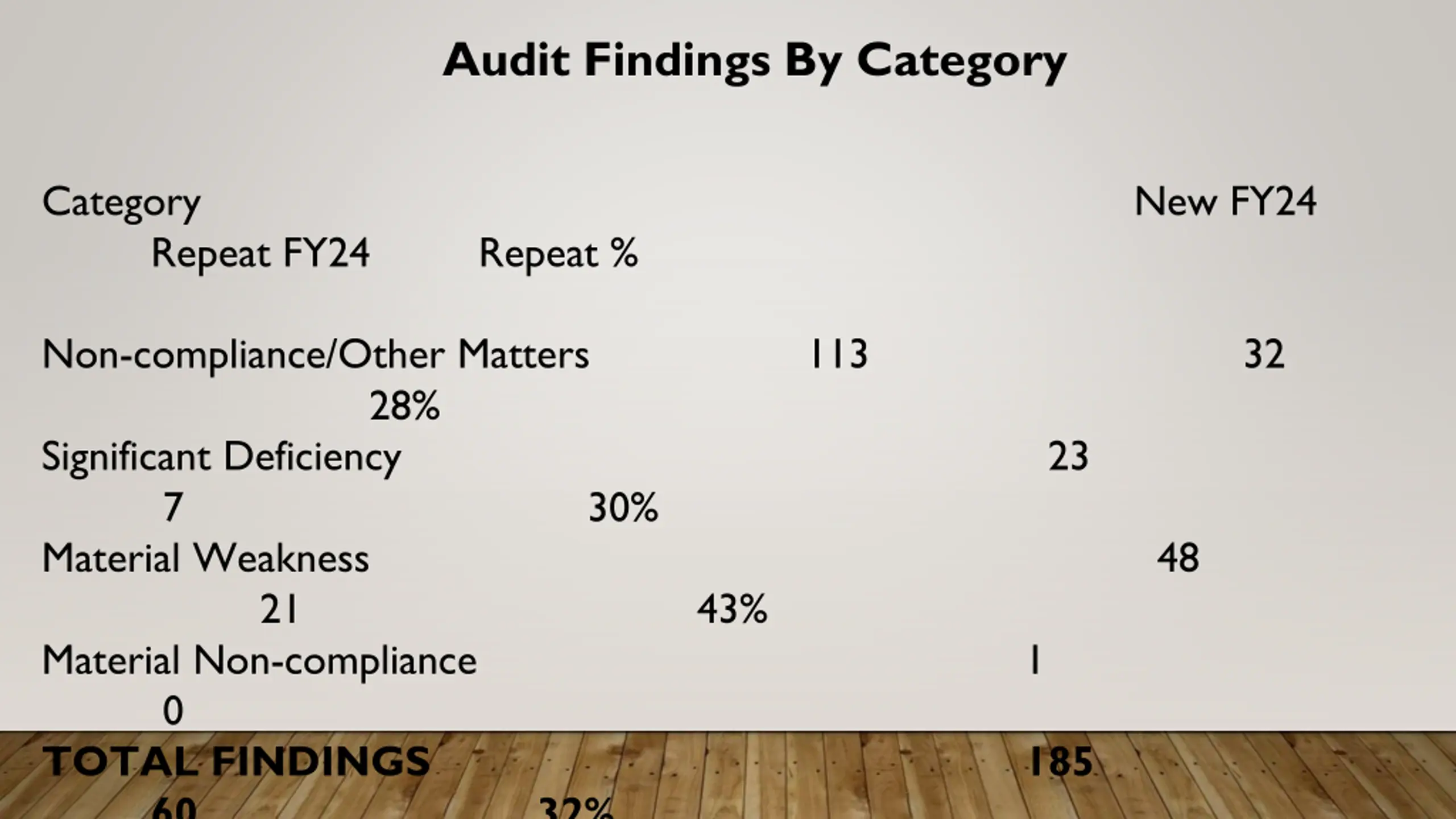 Audit Findings By Category Category New FY24 Repeat FY24 Repeat % Non-compliance/Other Matters 113 32 28% Significant Deficiency 7 Material Weakness 23 30% 48 21 43% Material Non-compliance 0 TOTAL FINDINGS 60 1 185 32%
