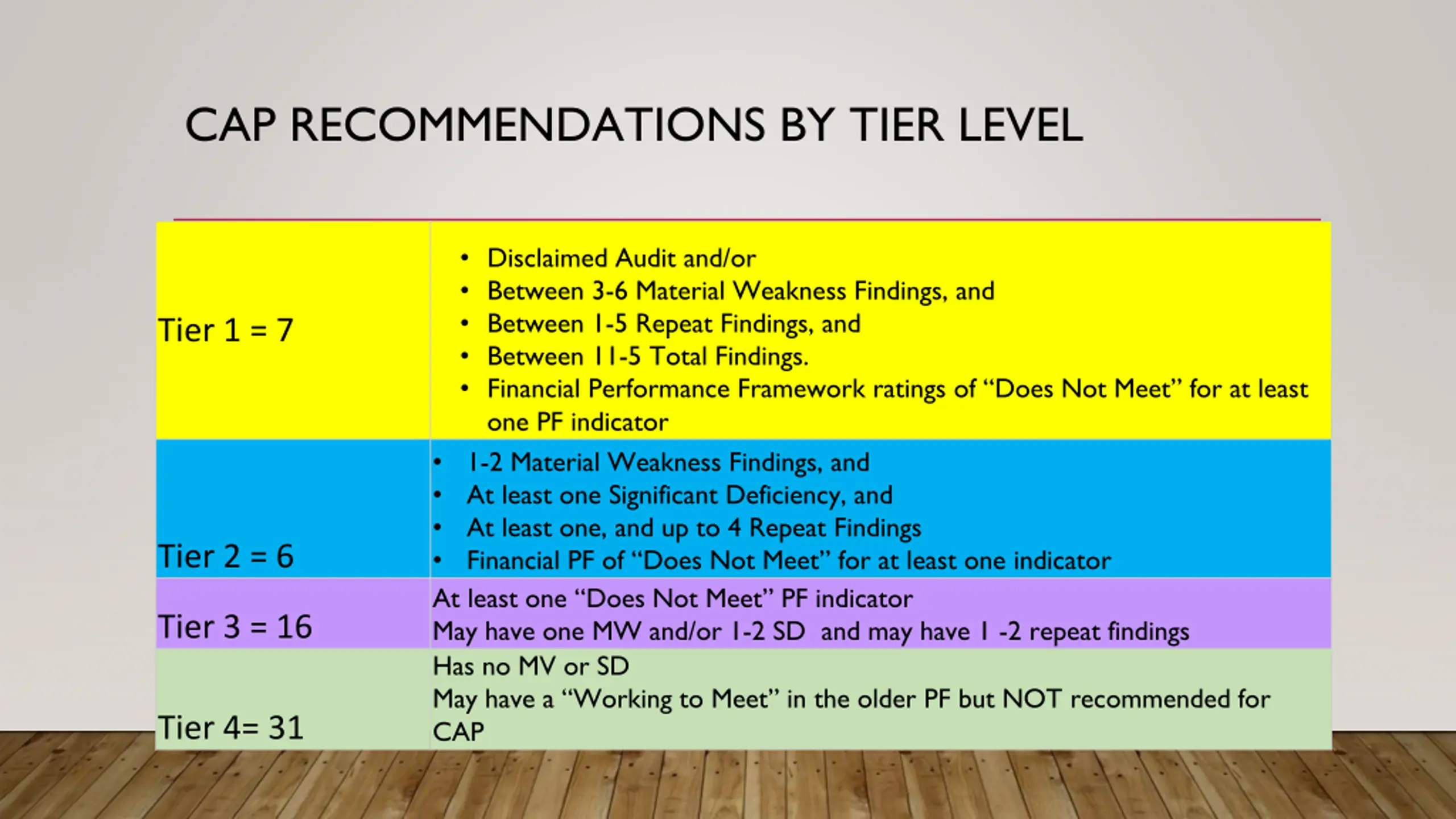 CAP RECOMMENDATIONS BY TIER LEVEL Disclaimed Audit and/or Between 3-6 Material Weakness Findings, and Between 1-5 Repeat Findings, and Between 11-5 Total Findings. Financial Performance Framework ratings of Does Not Meet for at least one PF indicator 1-2 Material Weakness Findings, and At least one Significant Deficiency, and At least one, and up to 4 Repeat Findings Financial PF of Does Not Meet for at least one indicator At least one Does Not Meet PF indicator May have one MW and/or 1-2 SD and may have 1 -2 repeat findings Has no MV or SD May have a Working to Meet in the older PF but NOT recommended for CAP Tier 1 = 7 Tier 2 = 6 Tier 3 = 16 Tier 4= 31