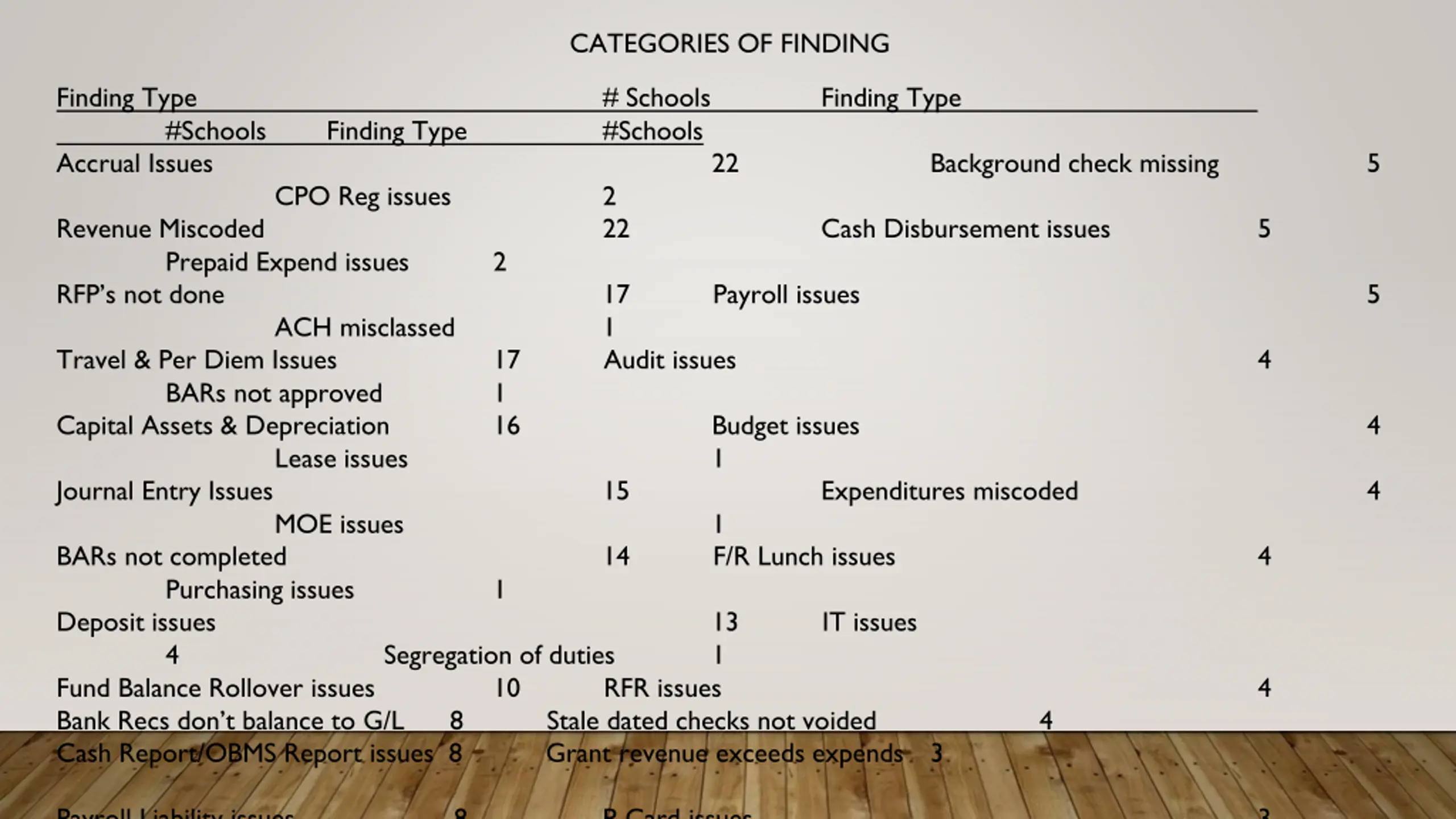 CATEGORIES OF FINDING Finding Type # Schools #Schools Finding Type #Schools Finding Type Accrual Issues 22 Background check missing 5 CPO Reg issues 2 22 Revenue Miscoded Cash Disbursement issues 5 Prepaid Expend issues RFP s not done 2 17 Payroll issues 1 17 Audit issues 1 16 5 ACH misclassed Travel & Per Diem Issues BARs not approved Capital Assets & Depreciation 4 Budget issues 1 4 Lease issues Journal Entry Issues 15 Expenditures miscoded 4 MOE issues 1 BARs not completed Purchasing issues Deposit issues 4 Fund Balance Rollover issues Bank Recs don t balance to G/L 8 Stale dated checks not voided Cash Report/OBMS Report issues 8 Grant revenue exceeds expends 14 F/R Lunch issues 4 1 13 IT issues 1 Segregation of duties 10 RFR issues 4 4 3 Payroll Liability issues 8 P-Card issues 3