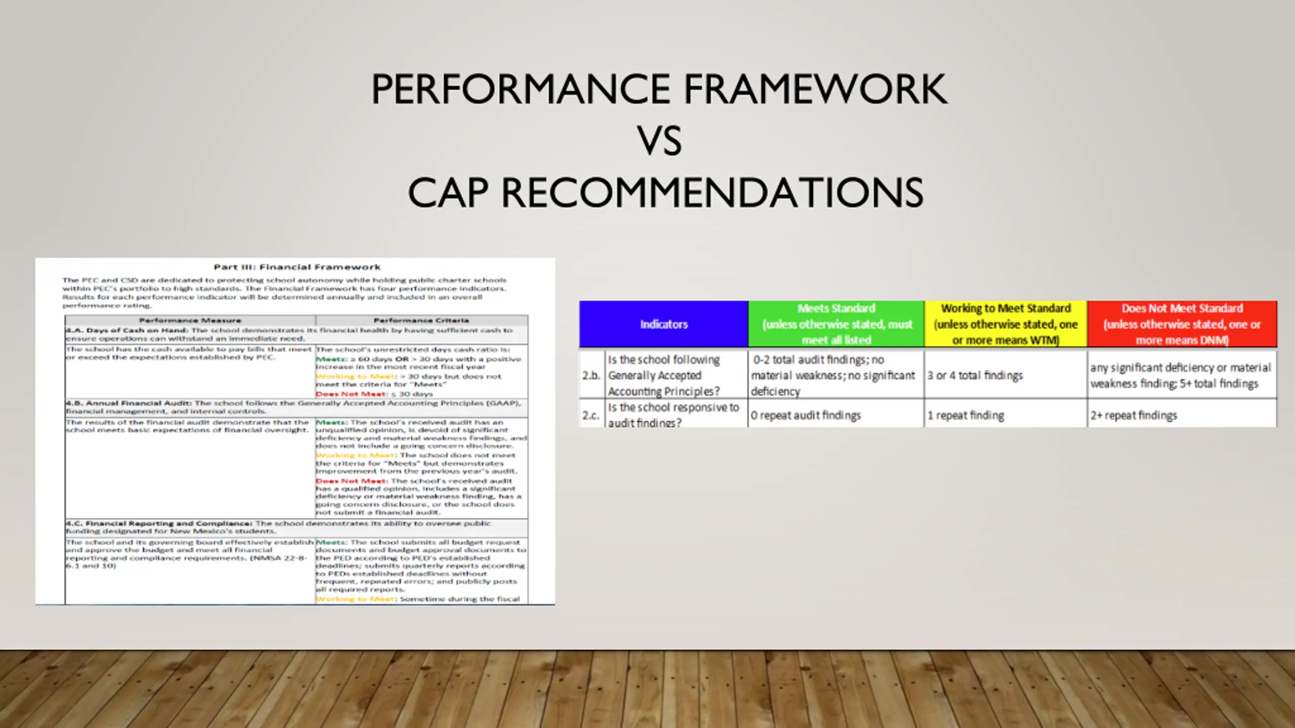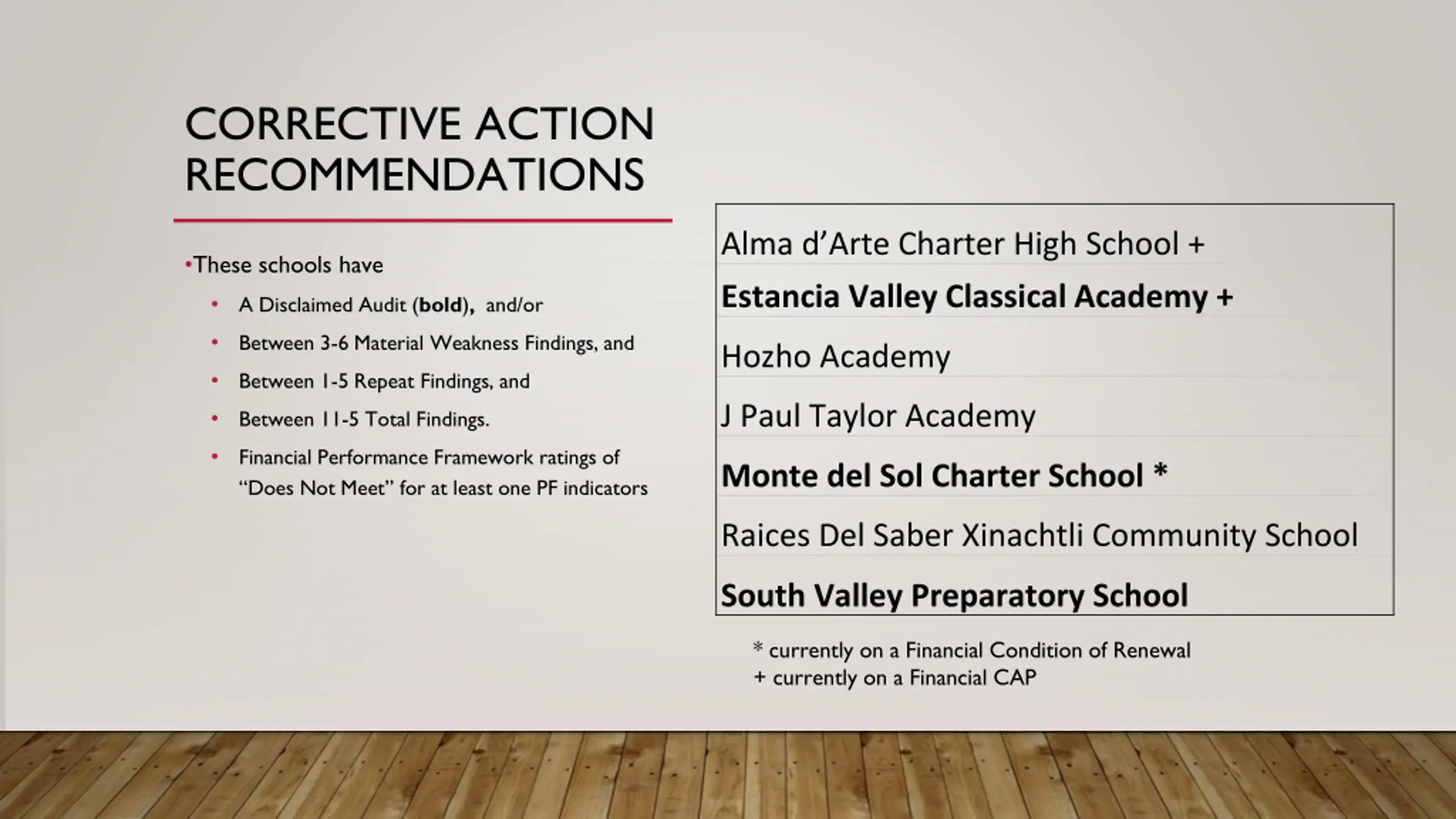 CORRECTIVE ACTION RECOMMENDATIONS Alma d Arte Charter High School + These schools have A Disclaimed Audit (bold), and/or Between 3-6 Material Weakness Findings, and Between 1-5 Repeat Findings, and Between 11-5 Total Findings. Financial Performance Framework ratings of Does Not Meet for at least one PF indicators Estancia Valley Classical Academy + Hozho Academy J Paul Taylor Academy Monte del Sol Charter School * Raices Del Saber Xinachtli Community School South Valley Preparatory School * currently on a Financial Condition of Renewal + currently on a Financial CAP