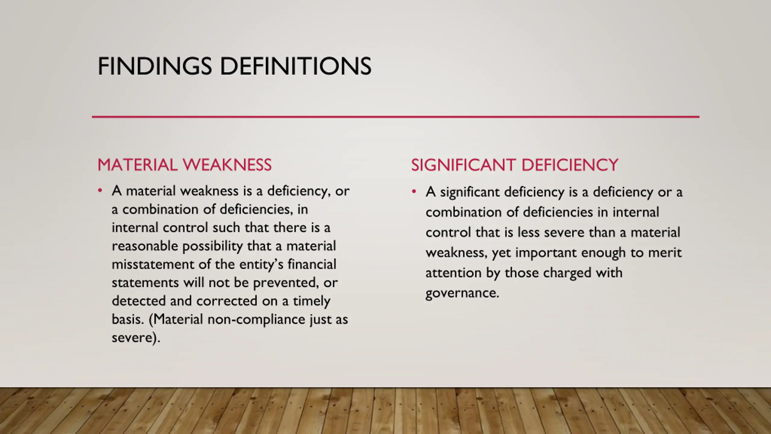 FINDINGS DEFINITIONS MATERIAL WEAKNESS A material weakness is a deficiency, or a combination of deficiencies, in internal control such that there is a reasonable possibility that a material misstatement of the entity s financial statements will not be prevented, or detected and corrected on a timely basis. (Material non-compliance just as severe). SIGNIFICANT DEFICIENCY A significant deficiency is a deficiency or a combination of deficiencies in internal control that is less severe than a material weakness, yet important enough to merit attention by those charged with governance.