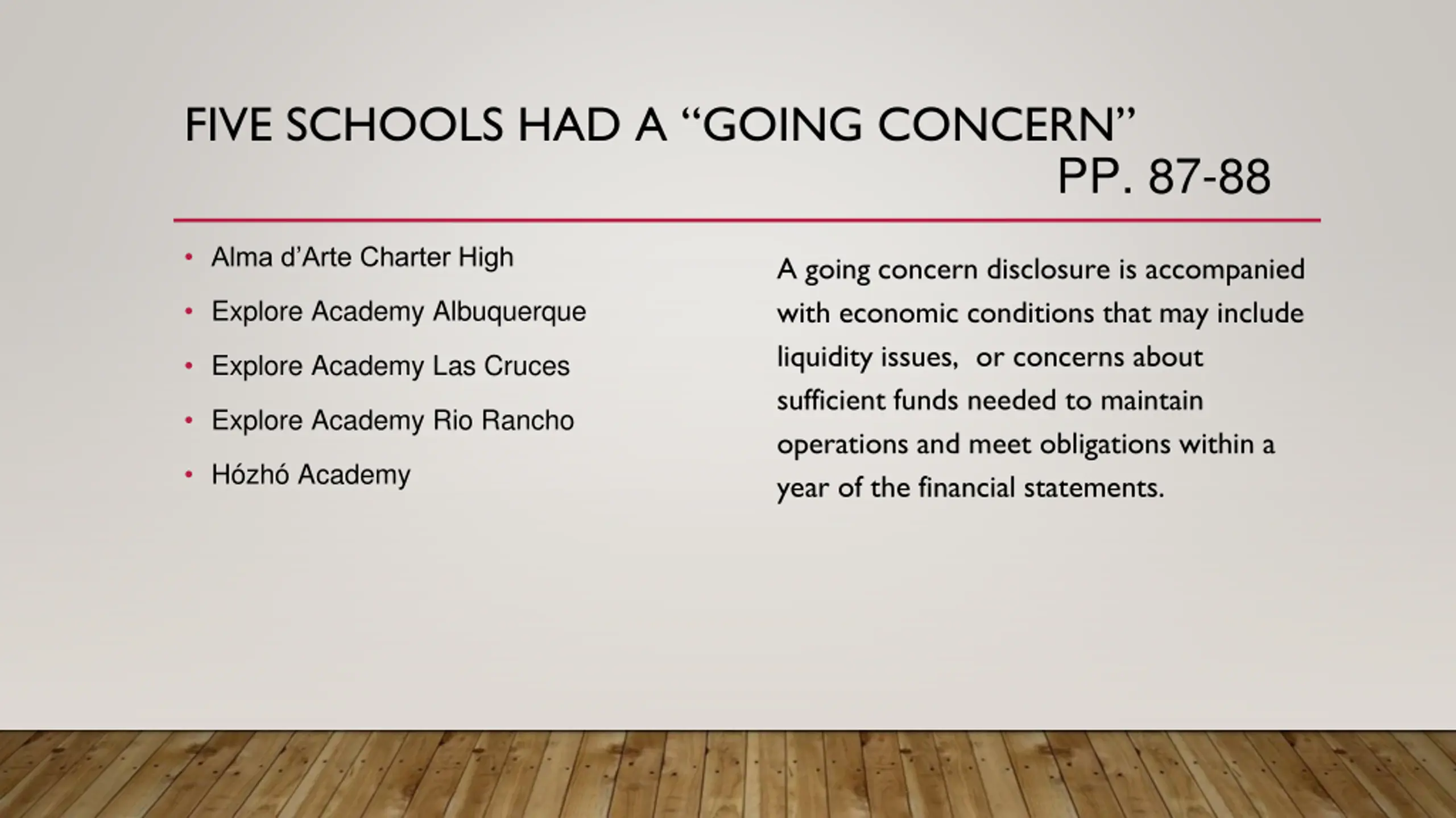 FIVE SCHOOLS HAD A GOING CONCERN PP. 87-88 Alma d Arte Charter High A going concern disclosure is accompanied with economic conditions that may include liquidity issues, or concerns about sufficient funds needed to maintain operations and meet obligations within a year of the financial statements. Explore Academy Albuquerque Explore Academy Las Cruces Explore Academy Rio Rancho H zh Academy
