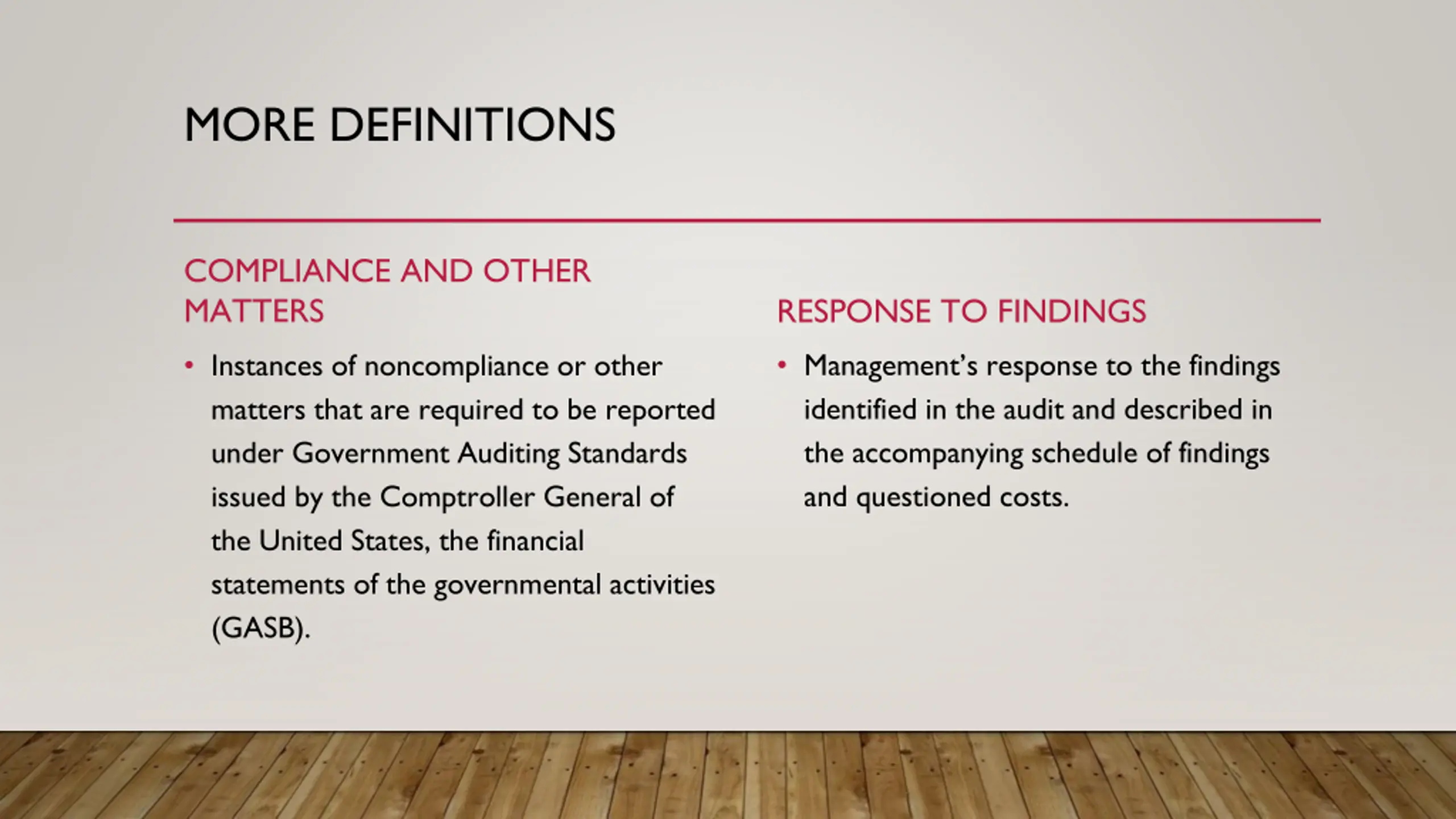 MORE DEFINITIONS COMPLIANCE AND OTHER MATTERS Instances of noncompliance or other matters that are required to be reported under Government Auditing Standards issued by the Comptroller General of the United States, the financial statements of the governmental activities (GASB). RESPONSE TO FINDINGS Management s response to the findings identified in the audit and described in the accompanying schedule of findings and questioned costs.