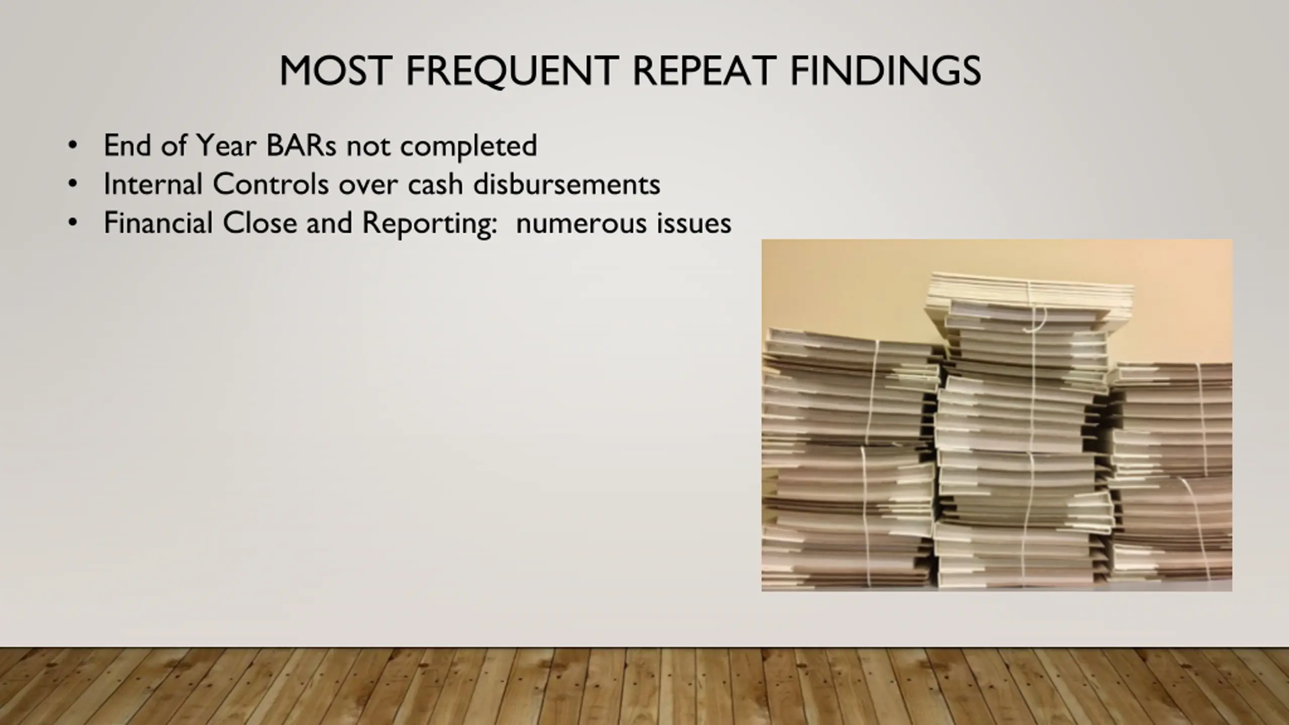 MOST FREQUENT REPEAT FINDINGS End of Year BARs not completed Internal Controls over cash disbursements Financial Close and Reporting: numerous issues