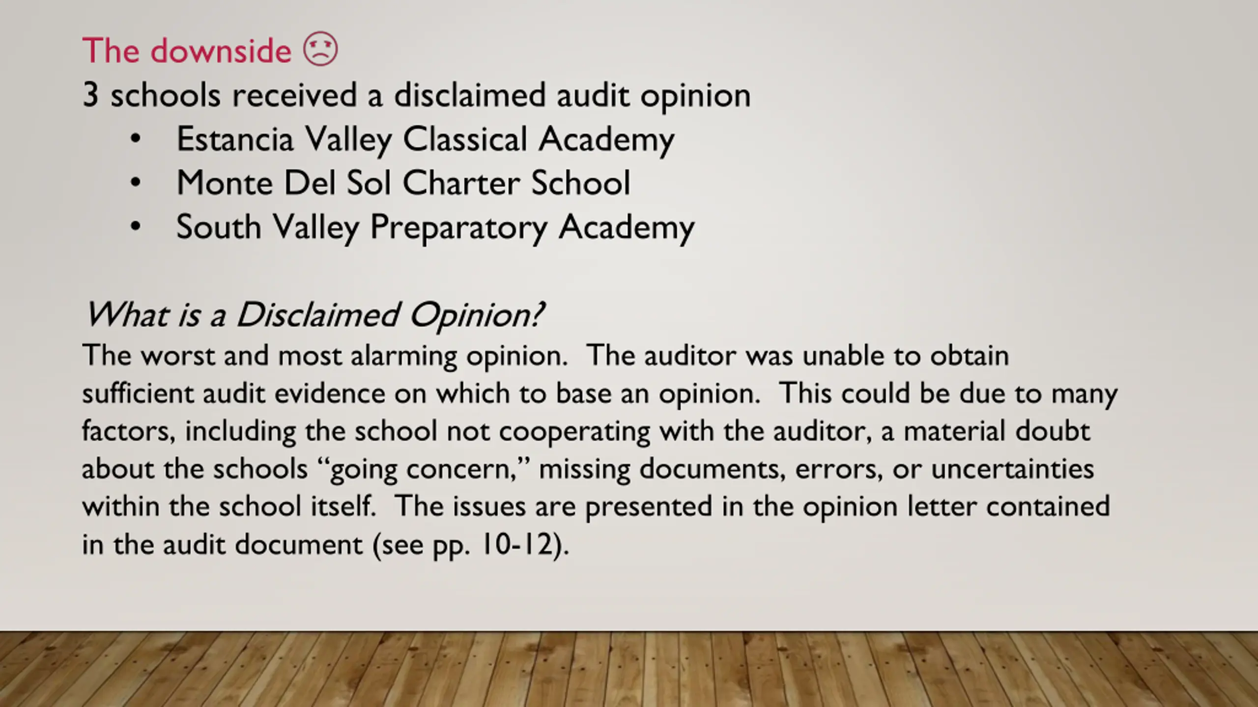 The downside 3 schools received a disclaimed audit opinion Estancia Valley Classical Academy Monte Del Sol Charter School South Valley Preparatory Academy What is a Disclaimed Opinion? The worst and most alarming opinion. The auditor was unable to obtain sufficient audit evidence on which to base an opinion. This could be due to many factors, including the school not cooperating with the auditor, a material doubt about the schools going concern, missing documents, errors, or uncertainties within the school itself. The issues are presented in the opinion letter contained in the audit document (see pp. 10-12).
