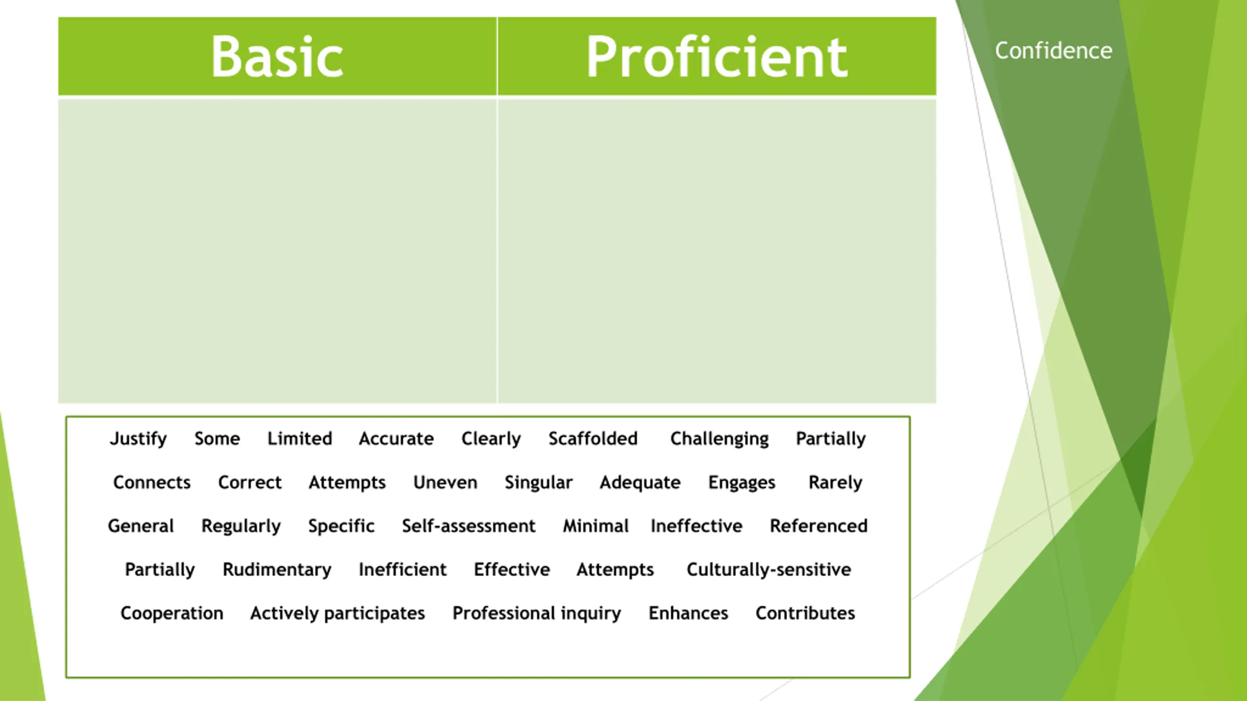 Basic Proficient Confidence Justify Some Limited Accurate Clearly Scaffolded Challenging Partially Connects Correct Attempts Uneven Singular Adequate Engages Rarely General Regularly Specific Self-assessment Minimal Ineffective Referenced Partially Rudimentary Inefficient Effective Attempts Culturally-sensitive Cooperation Actively participates Professional inquiry Enhances Contributes