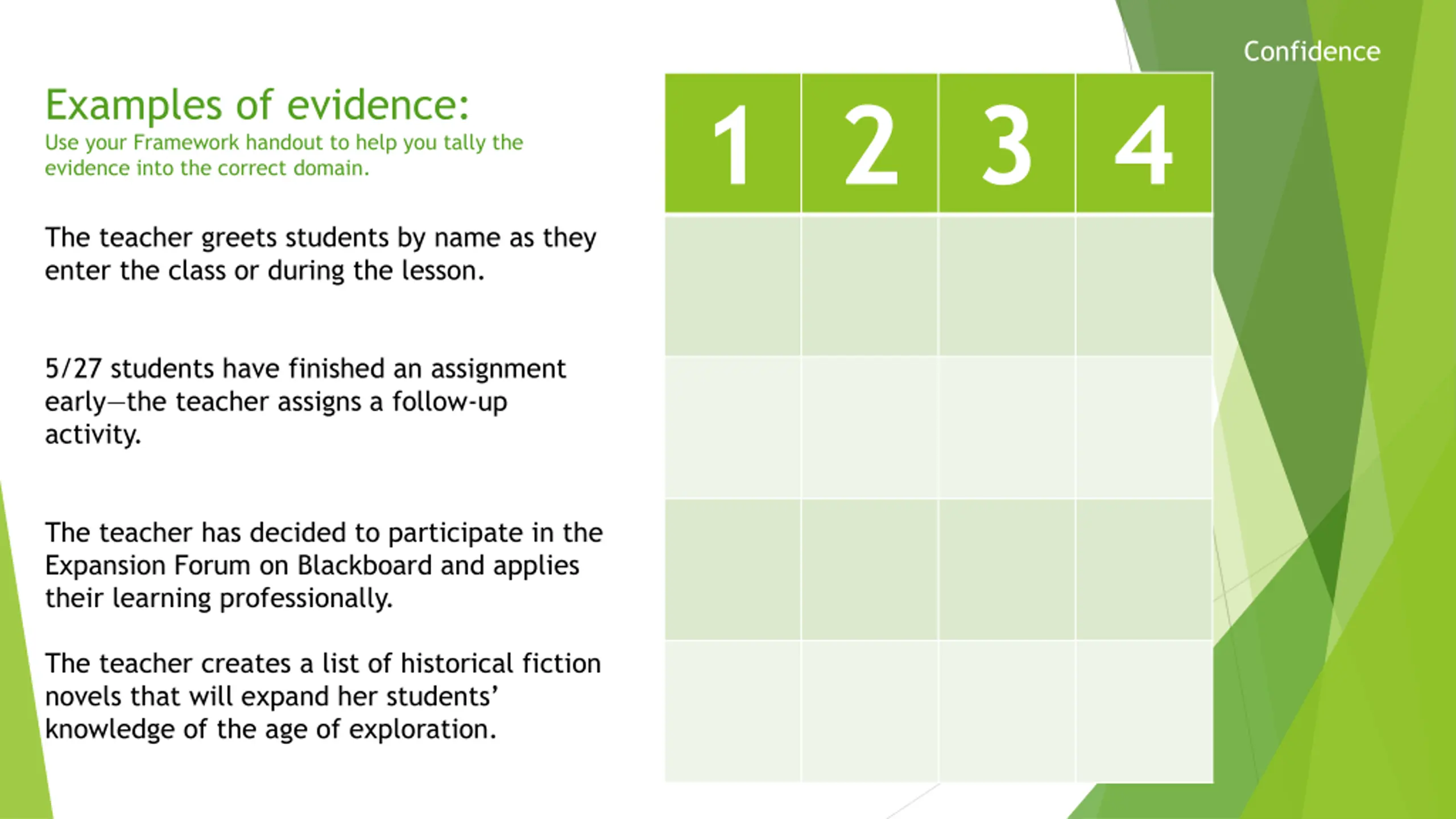Confidence Examples of evidence: Use your Framework handout to help you tally the evidence into the correct domain. 1 2 3 4 The teacher greets students by name as they enter the class or during the lesson. 5/27 students have finished an assignment early the teacher assigns a follow-up activity. The teacher has decided to participate in the Expansion Forum on Blackboard and applies their learning professionally. The teacher creates a list of historical fiction novels that will expand her students knowledge of the age of exploration.