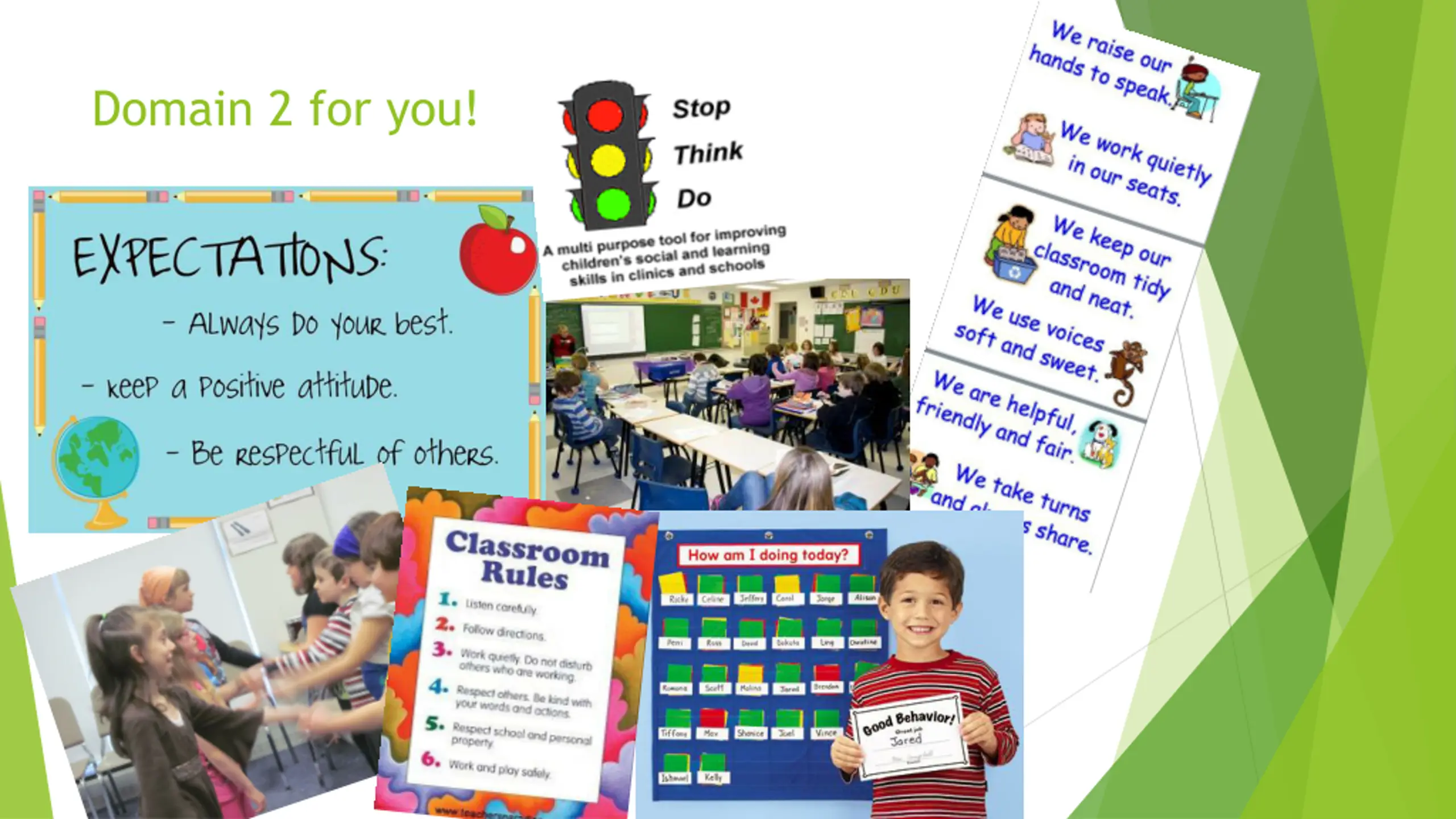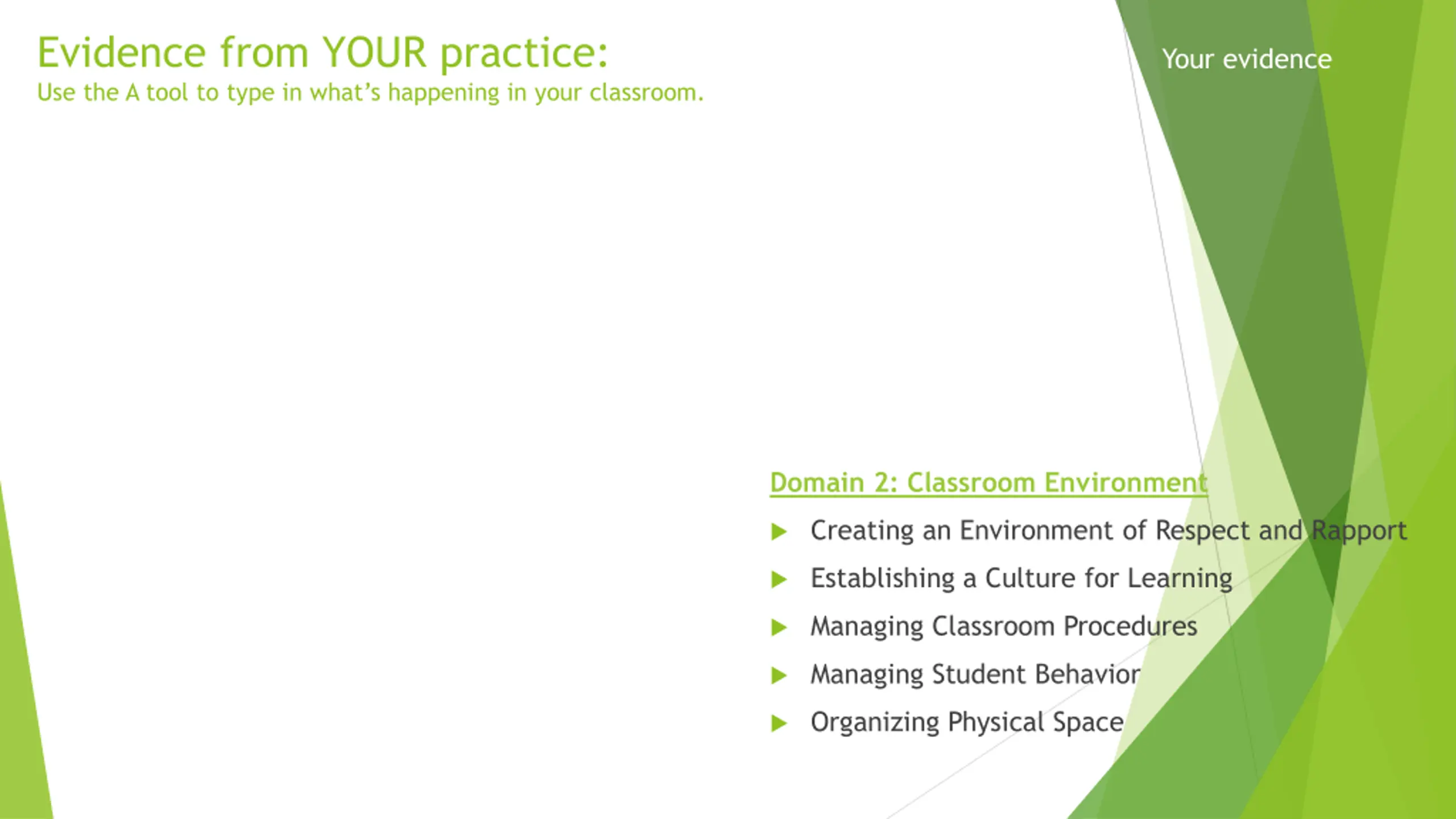 Evidence from YOUR practice: Use the A tool to type in what s happening in your classroom. Your evidence Domain 2: Classroom Environment Creating an Environment of Respect and Rapport Establishing a Culture for Learning Managing Classroom Procedures Managing Student Behavior Organizing Physical Space
