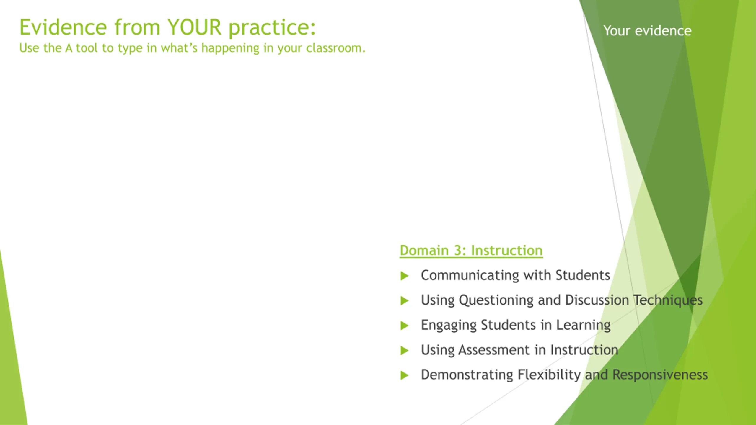Evidence from YOUR practice: Use the A tool to type in what s happening in your classroom. Your evidence Domain 3: Instruction Communicating with Students Using Questioning and Discussion Techniques Engaging Students in Learning Using Assessment in Instruction Demonstrating Flexibility and Responsiveness