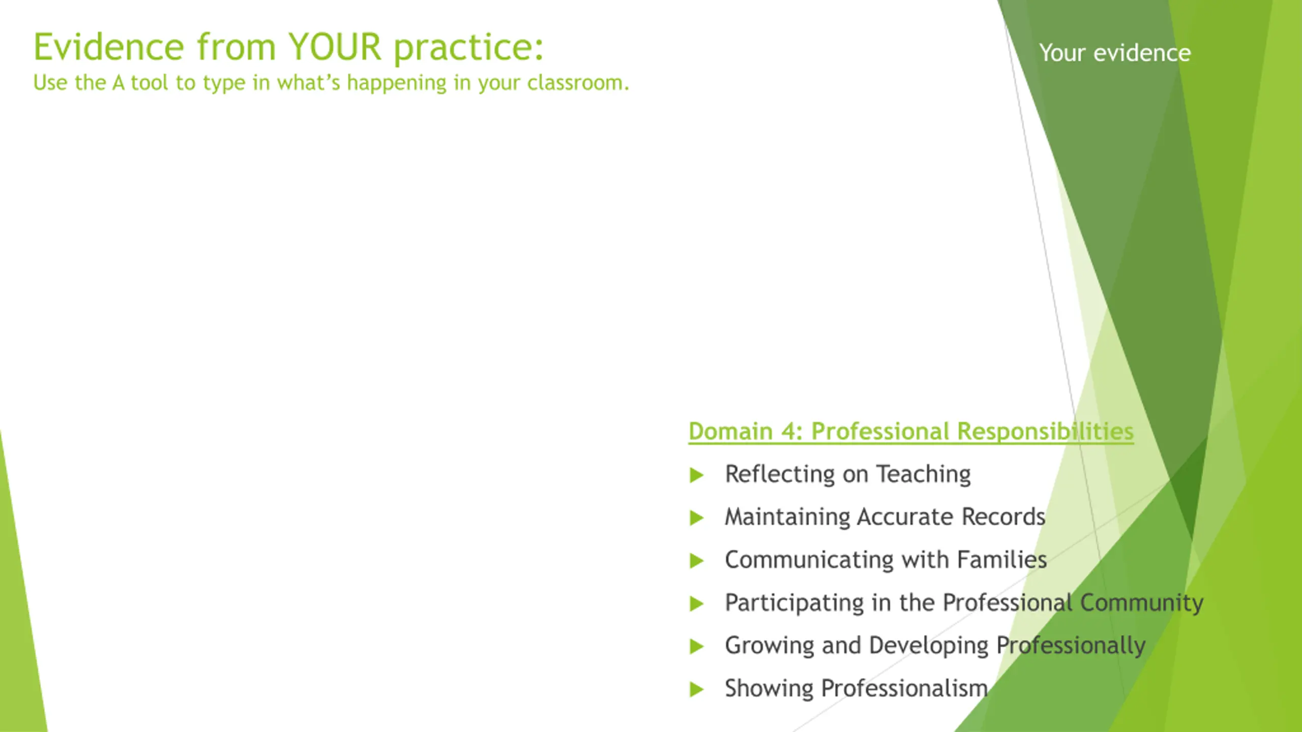 Evidence from YOUR practice: Use the A tool to type in what s happening in your classroom. Your evidence Domain 4: Professional Responsibilities Reflecting on Teaching Maintaining Accurate Records Communicating with Families Participating in the Professional Community Growing and Developing Professionally Showing Professionalism