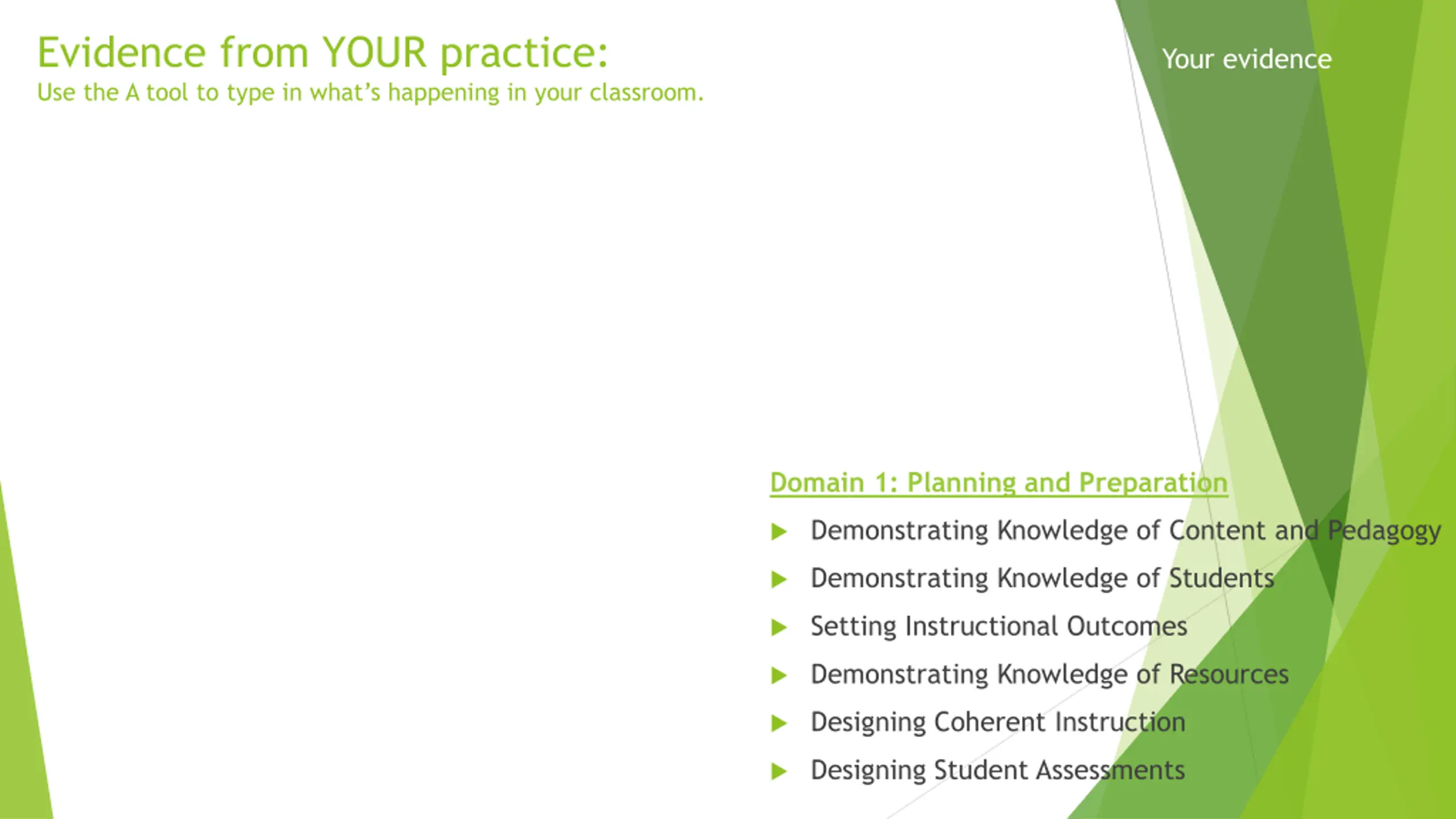 Evidence from YOUR practice: Use the A tool to type in what s happening in your classroom. Your evidence Domain 1: Planning and Preparation Demonstrating Knowledge of Content and Pedagogy Demonstrating Knowledge of Students Setting Instructional Outcomes Demonstrating Knowledge of Resources Designing Coherent Instruction Designing Student Assessments
