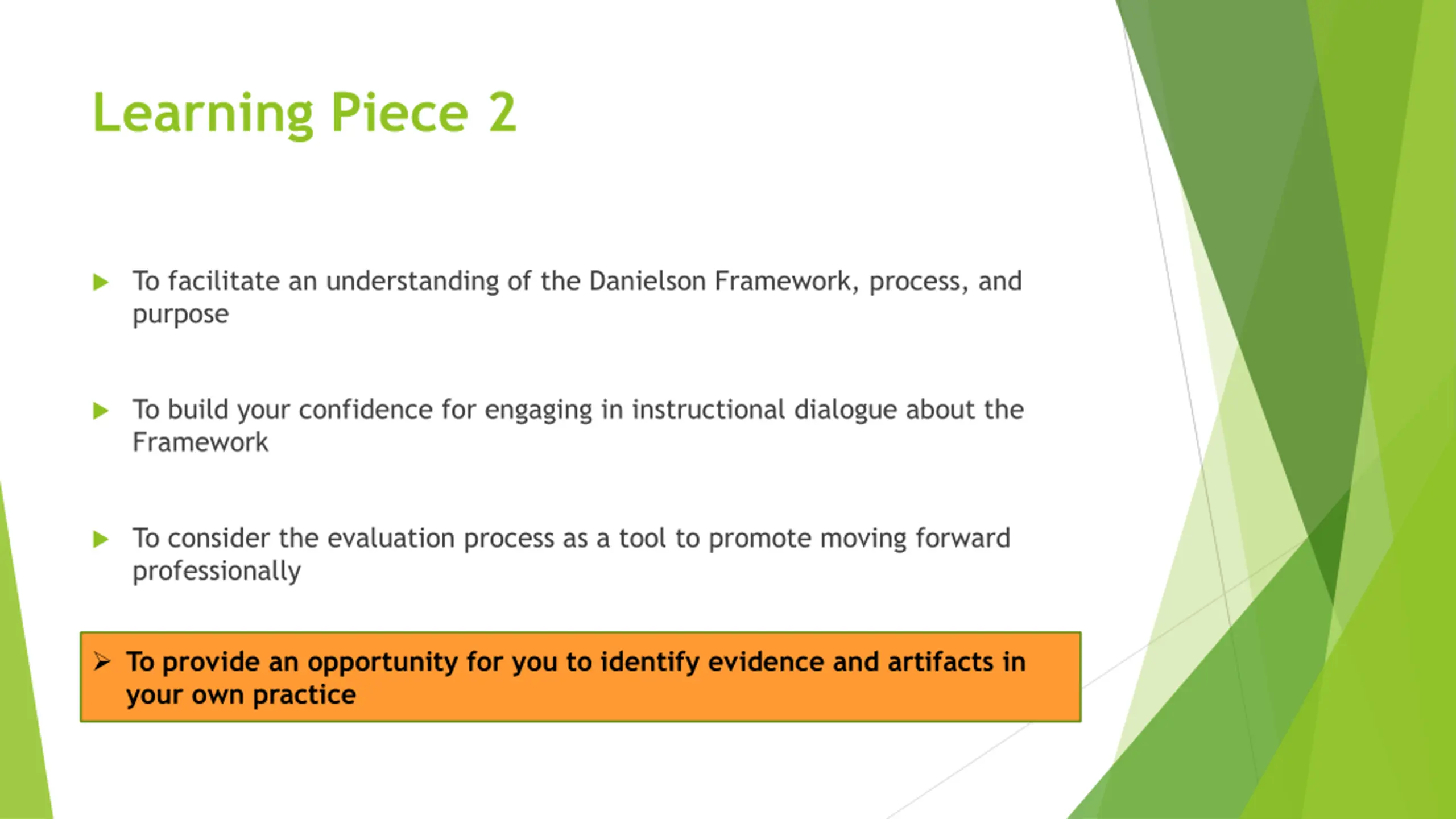 Learning Piece 2 To facilitate an understanding of the Danielson Framework, process, and purpose To build your confidence for engaging in instructional dialogue about the Framework To consider the evaluation process as a tool to promote moving forward professionally To provide an opportunity for you to identify evidence and artifacts in your own practice