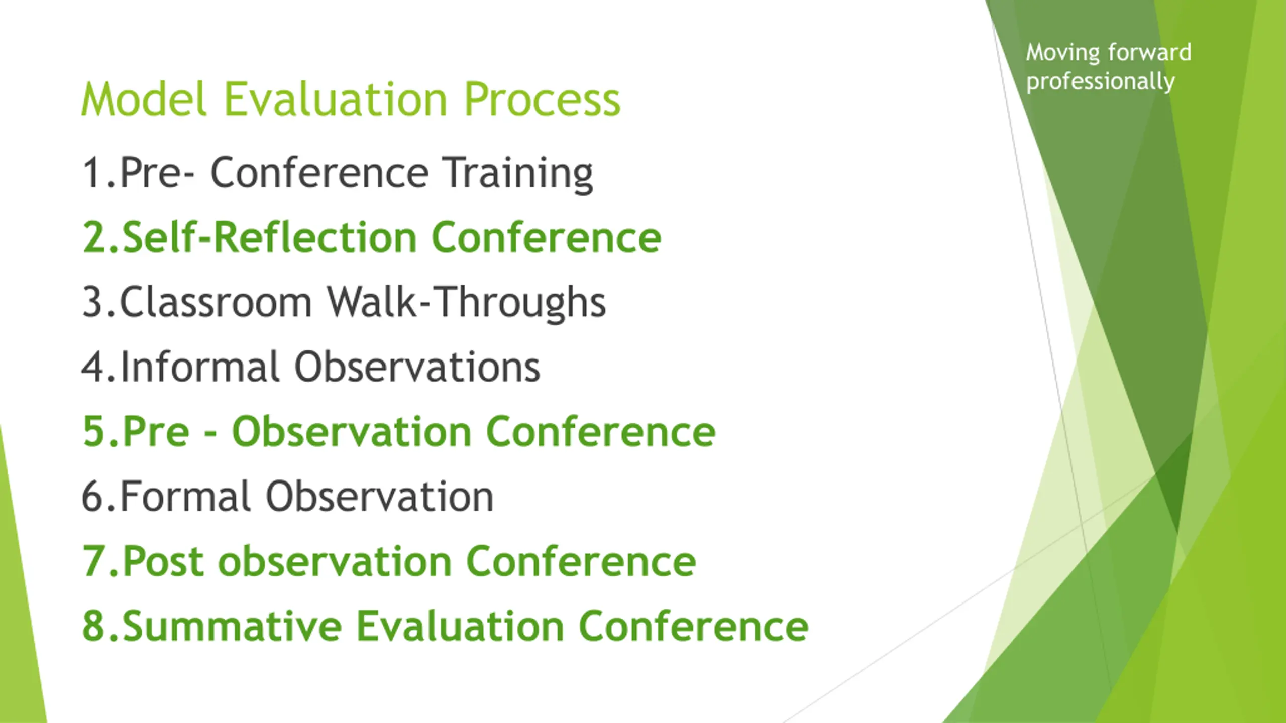 Moving forward professionally Model Evaluation Process 1.Pre- Conference Training 2.Self-Reflection Conference 3.Classroom Walk-Throughs 4.Informal Observations 5.Pre - Observation Conference 6.Formal Observation 7.Post observation Conference 8.Summative Evaluation Conference