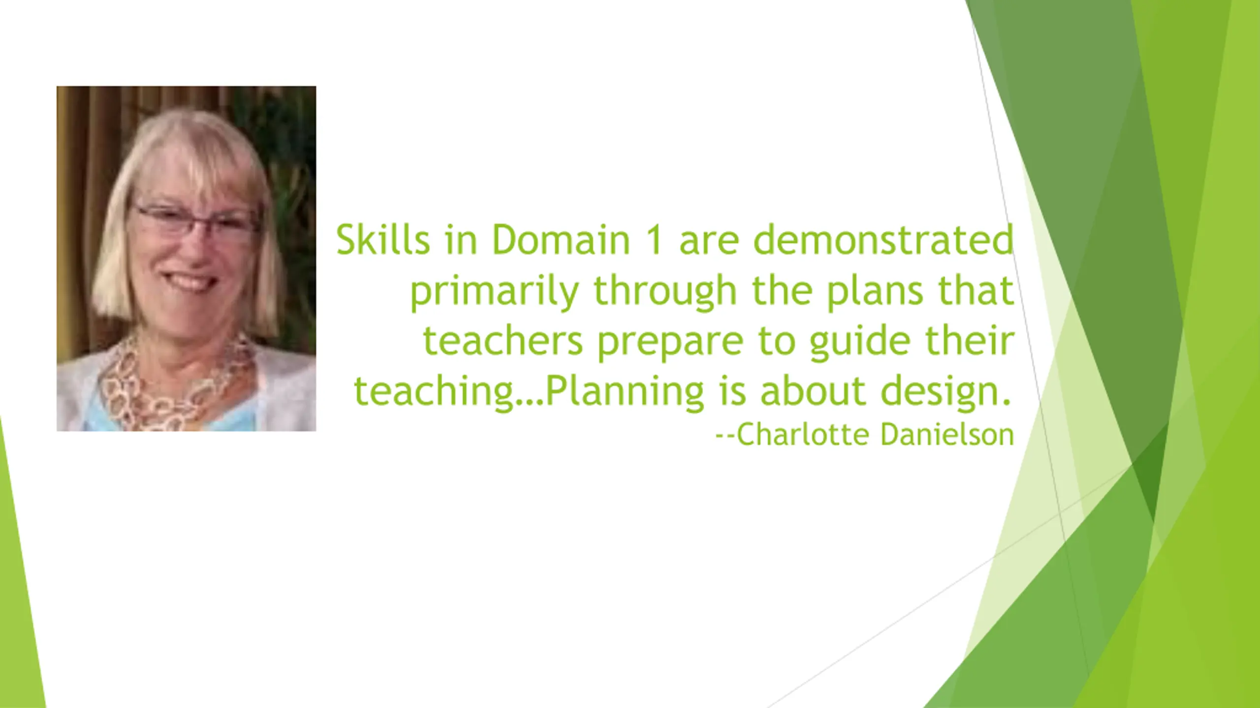 Skills in Domain 1 are demonstrated primarily through the plans that teachers prepare to guide their teaching Planning is about design. --Charlotte Danielson