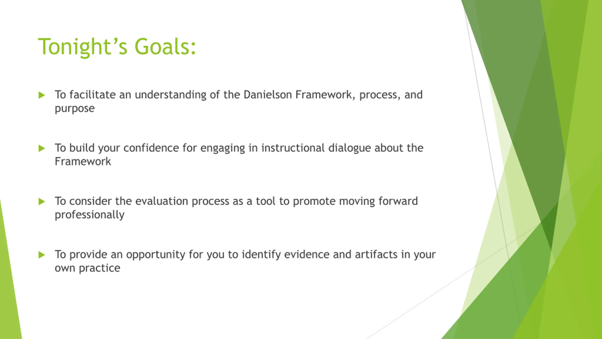 Tonights Goals: To facilitate an understanding of the Danielson Framework, process, and purpose To build your confidence for engaging in instructional dialogue about the Framework To consider the evaluation process as a tool to promote moving forward professionally To provide an opportunity for you to identify evidence and artifacts in your own practice
