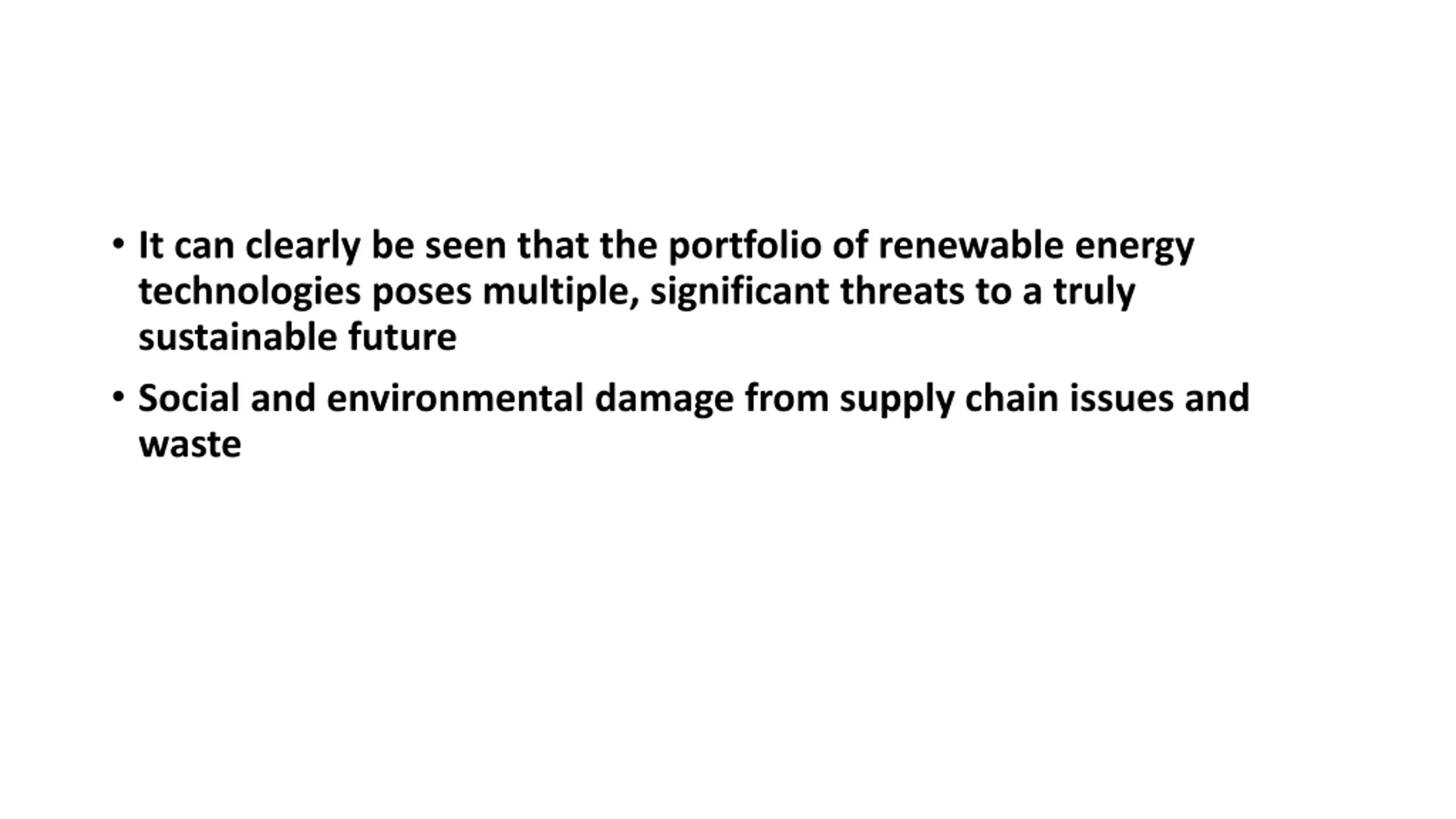 It can clearly be seen that the portfolio of renewable energy technologies poses multiple, significant threats to a truly sustainable future Social and environmental damage from supply chain issues and waste