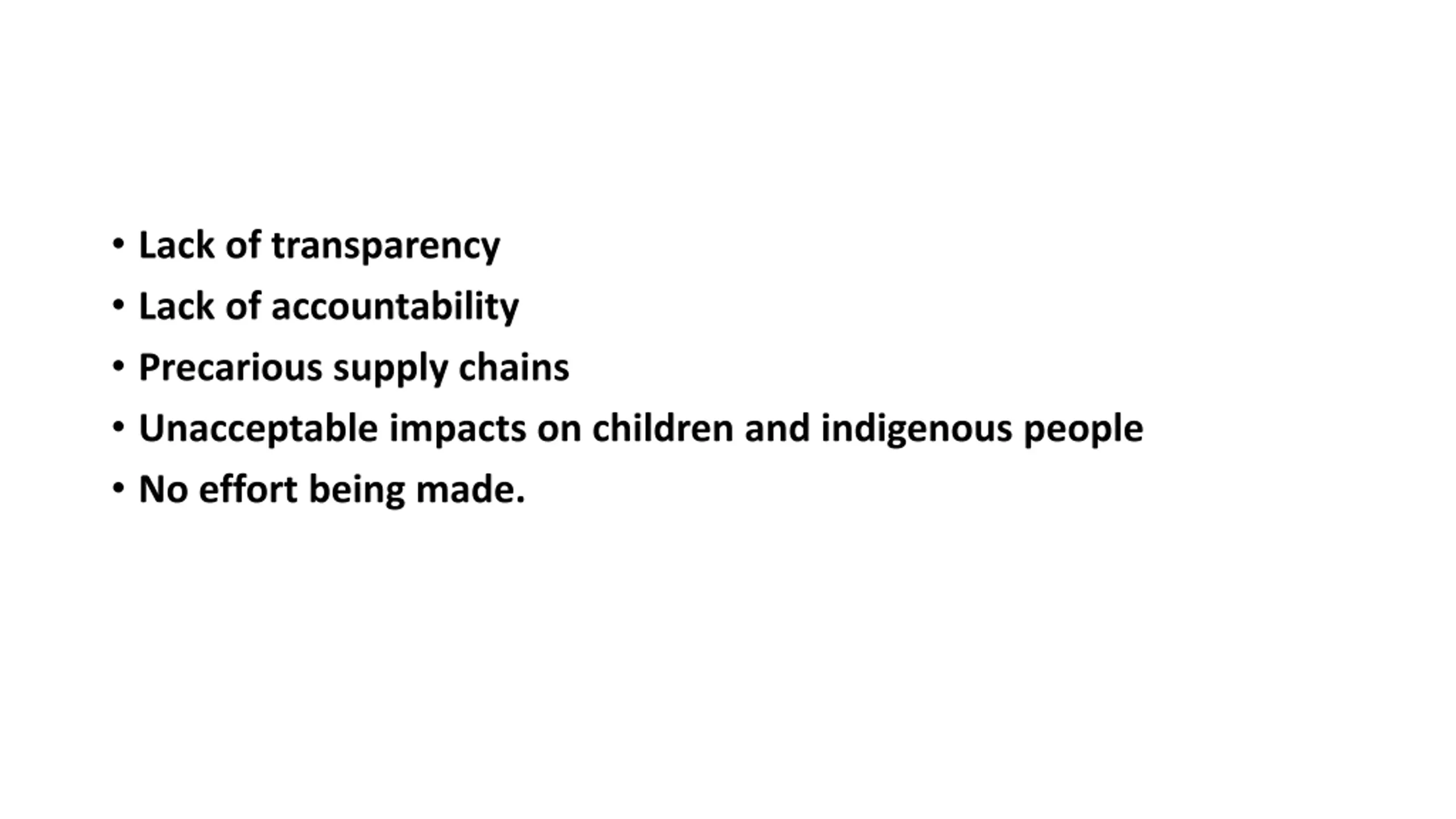 Lack of transparency Lack of accountability Precarious supply chains Unacceptable impacts on children and indigenous people No effort being made.