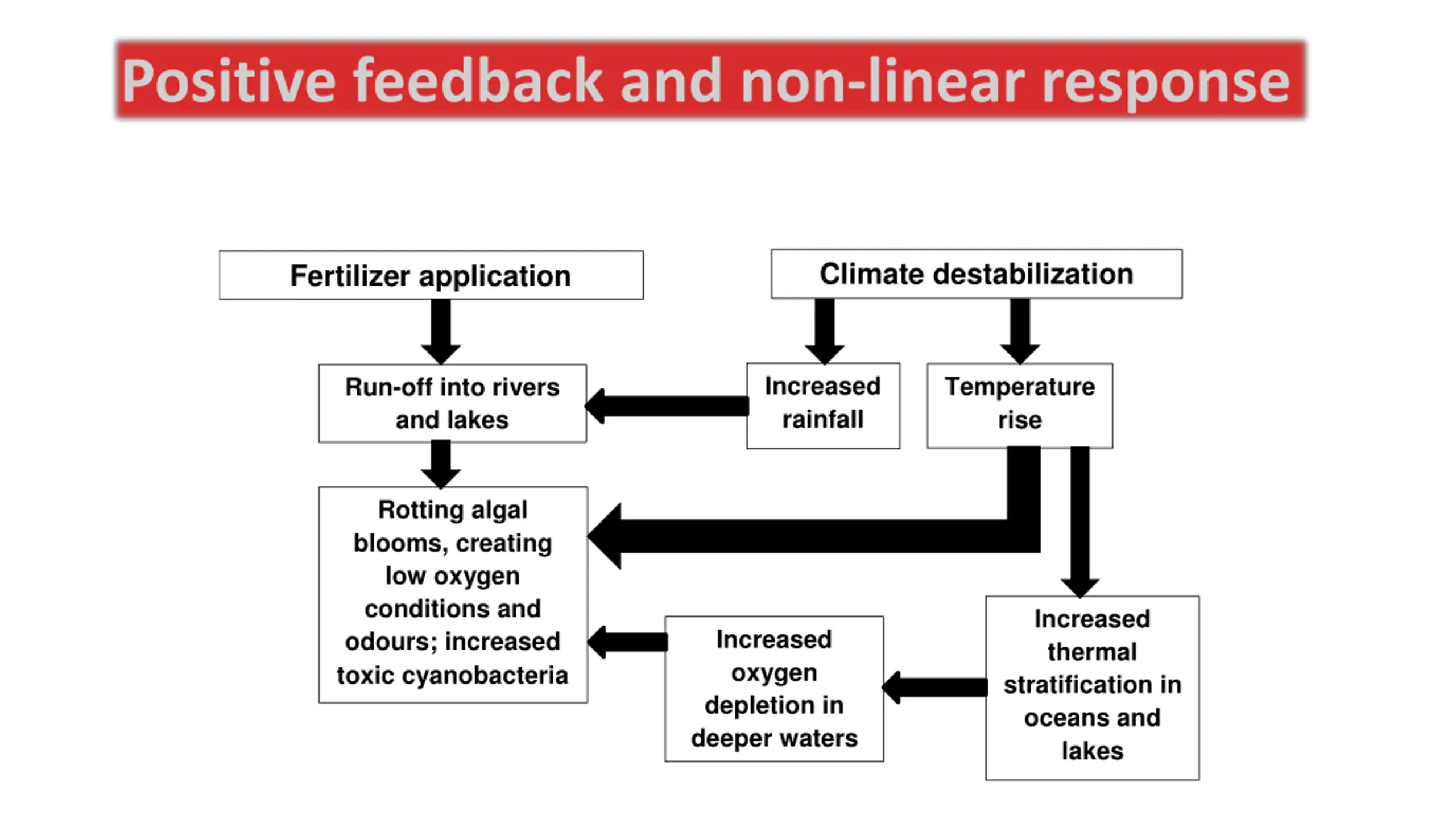 Positive feedback and non-linear response Eutrohication Climate destabilization Fertilizer application Increased rainfall Temperature rise Run-off into rivers and lakes 01111 Rotting algal blooms, creating low oxygen conditions and odours; increased toxic cyanobacteria Increased thermal stratification in oceans and lakes Increased oxygen depletion in deeper waters