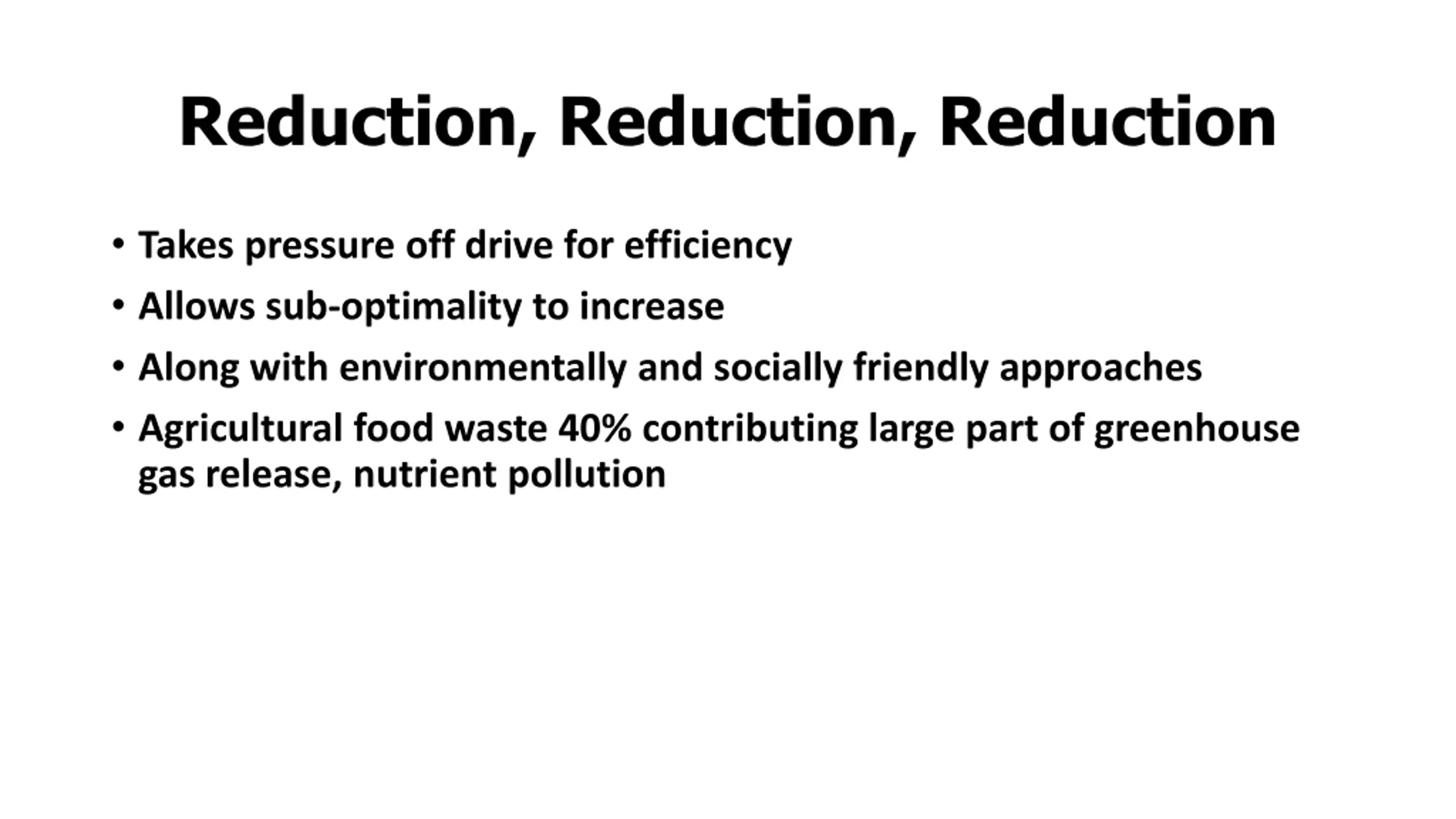 Reduction, Reduction, Reduction Takes pressure off drive for efficiency Allows sub-optimality to increase Along with environmentally and socially friendly approaches Agricultural food waste 40% contributing large part of greenhouse gas release, nutrient pollution