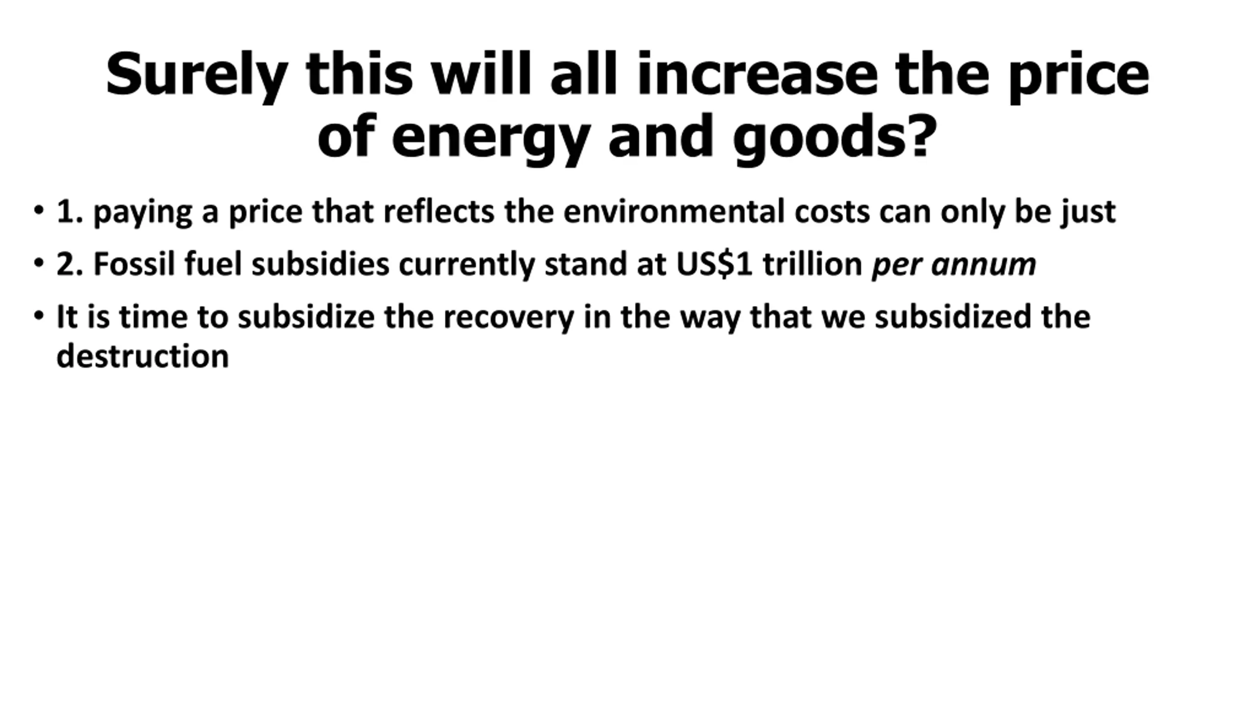 Surely this will all increase the price of energy and goods? 1. paying a price that reflects the environmental costs can only be just 2. Fossil fuel subsidies currently stand at US$1 trillion per annum It is time to subsidize the recovery in the way that we subsidized the destruction