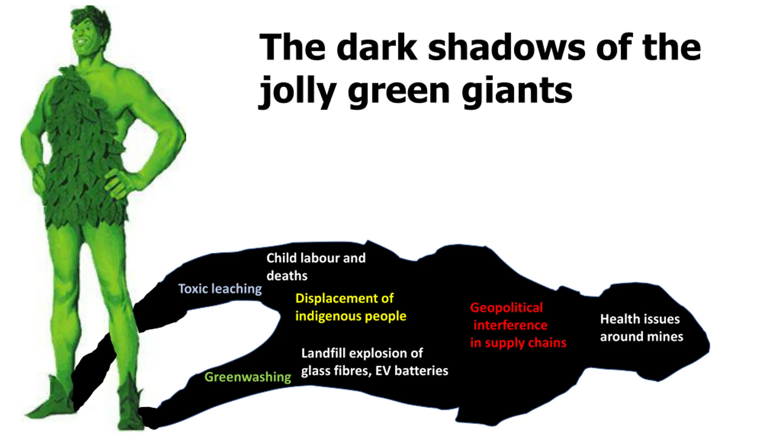 The dark shadows of the The dark shadows of the jolly green giant jolly green giants Child labour and deaths Toxic leaching Displacement of indigenous people Geopolitical interference in supply chains Health issues around mines Landfill explosion of glass fibres, EV batteries Greenwashing