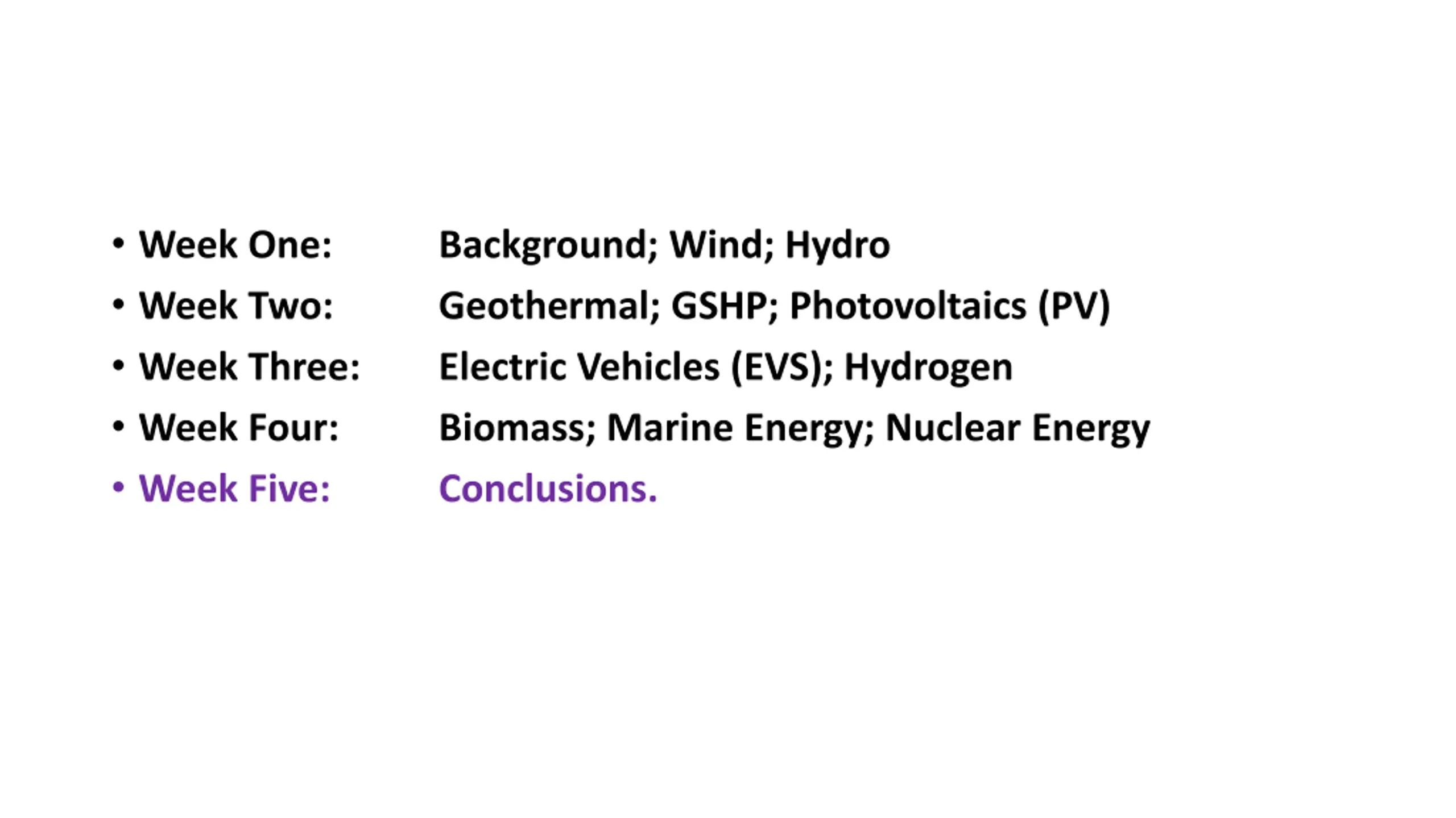 Week One: Week Two: Week Three: Week Four: Week Five: Background; Wind; Hydro Geothermal; GSHP; Photovoltaics (PV) Electric Vehicles (EVS); Hydrogen Biomass; Marine Energy; Nuclear Energy Conclusions.