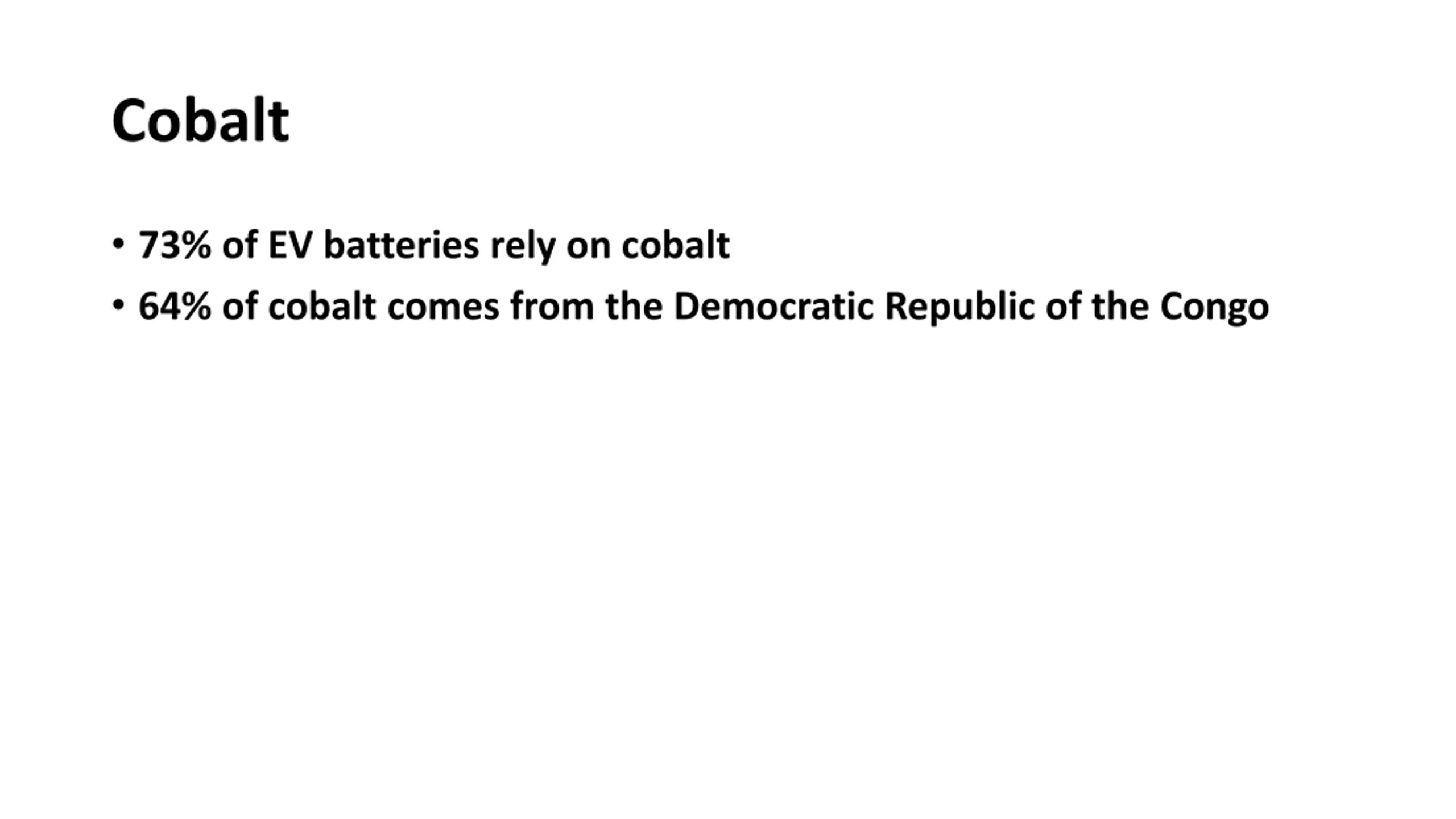 Cobalt 73% of EV batteries rely on cobalt 64% of cobalt comes from the Democratic Republic of the Congo