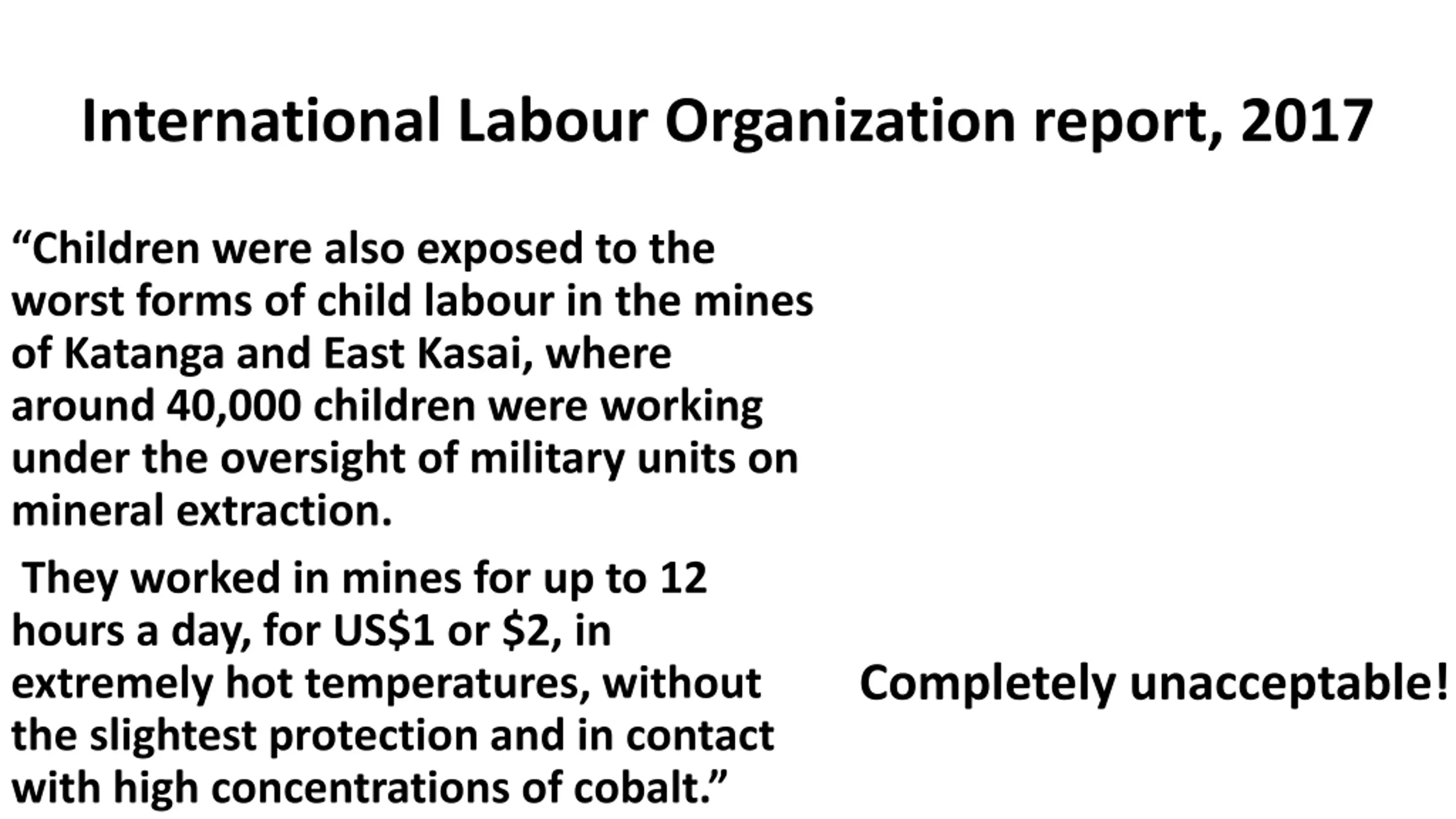 International Labour Organization report, 2017 Children were also exposed to the worst forms of child labour in the mines of Katanga and East Kasai, where around 40,000 children were working under the oversight of military units on mineral extraction. They worked in mines for up to 12 hours a day, for US$1 or $2, in extremely hot temperatures, without the slightest protection and in contact with high concentrations of cobalt. Completely unacceptable!