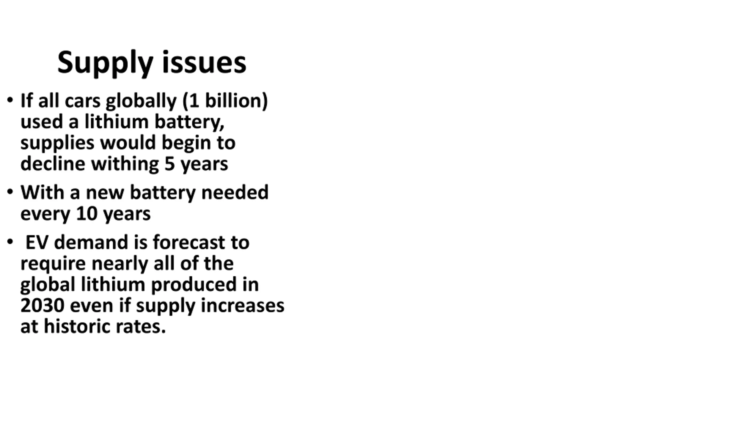 Supply issues If all cars globally (1 billion) used a lithium battery, supplies would begin to decline withing 5 years With a new battery needed every 10 years EV demand is forecast to require nearly all of the global lithium produced in 2030 even if supply increases at historic rates.
