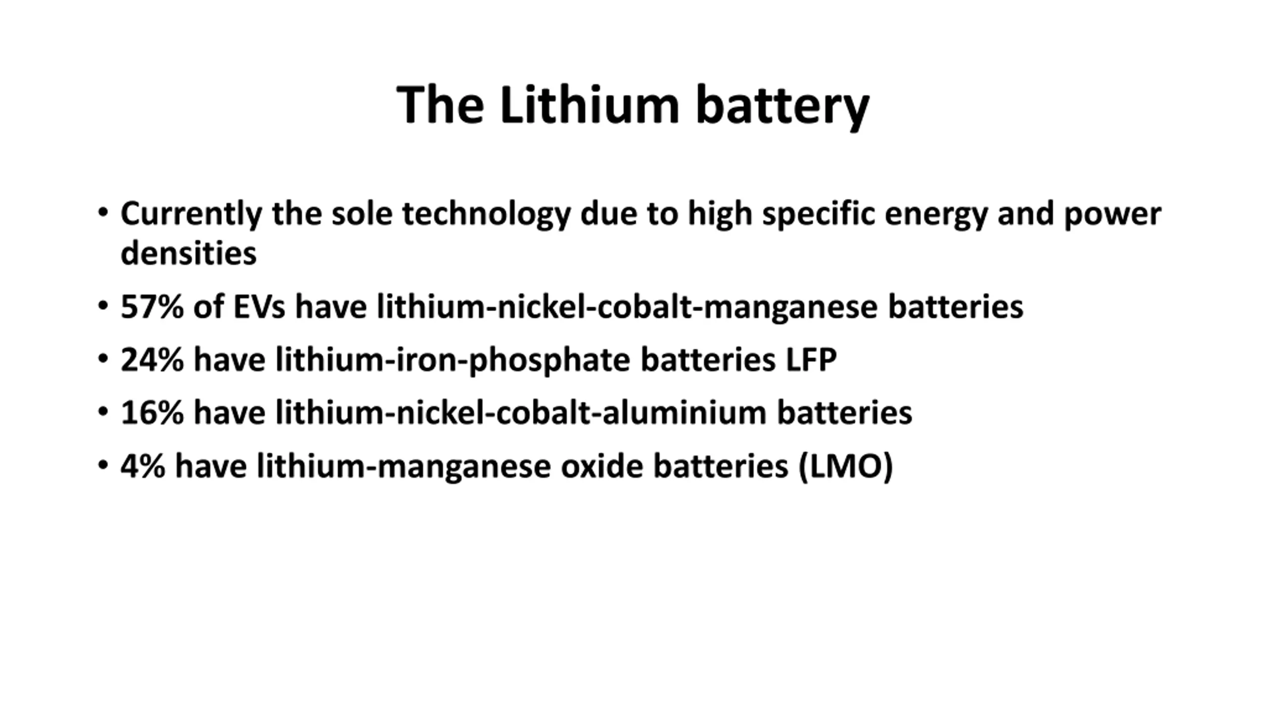 The Lithium battery Currently the sole technology due to high specific energy and power densities 57% of EVs have lithium-nickel-cobalt-manganese batteries 24% have lithium-iron-phosphate batteries LFP 16% have lithium-nickel-cobalt-aluminium batteries 4% have lithium-manganese oxide batteries (LMO)