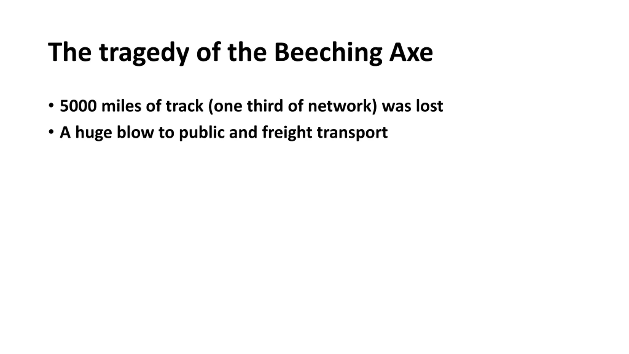 The tragedy of the Beeching Axe 5000 miles of track (one third of network) was lost A huge blow to public and freight transport