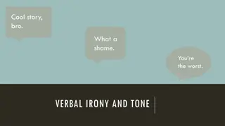 Verbal Irony The simplest kind of irony. You use it everyday when you say one thing and really mean another. It is often similar to a sarcastic response. Examples: When you appear to be sick and someone asks you if you re okay. You say Of course! But in the meantime you are vomiting and fainting. Your boyfriend shows up in ripped up jeans and a stained t- shirt. With a smirk, you say, "Oh! I see you dressed up for our date. We must be going to a posh restaurant." http://www.youtube.com/watch?v=PUadZ6ALU0M