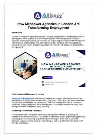 interactions that require human empathy and problem-solving. Employee Wellbeing Focus: As worker well-being gains importance, agencies and businesses may collaborate to improve working conditions, offer competitive benefits, and provide career development opportunities to retain top talent. Conclusion: A Balanced Approach for a Sustainable Future Call center employment agencies are vital to the economy, creating jobs, enhancing business productivity, and supporting SMEs. They contribute to economic stability and growth, reduce unemployment rates, and promote workforce mobility. By investing in human capital and inclusive employment practices, they offer long-term economic benefits. Alliance International is a leading call center employment agency dedicated to connecting businesses with top-tier talent. Our comprehensive services and industry expertise ensure you find the perfect candidates for your call center needs. Contact us today to learn more about how we can support your hiring efforts and help you achieve your business goals. sales@alliancerecruitmentagency.com www.allianceinternational.co.in