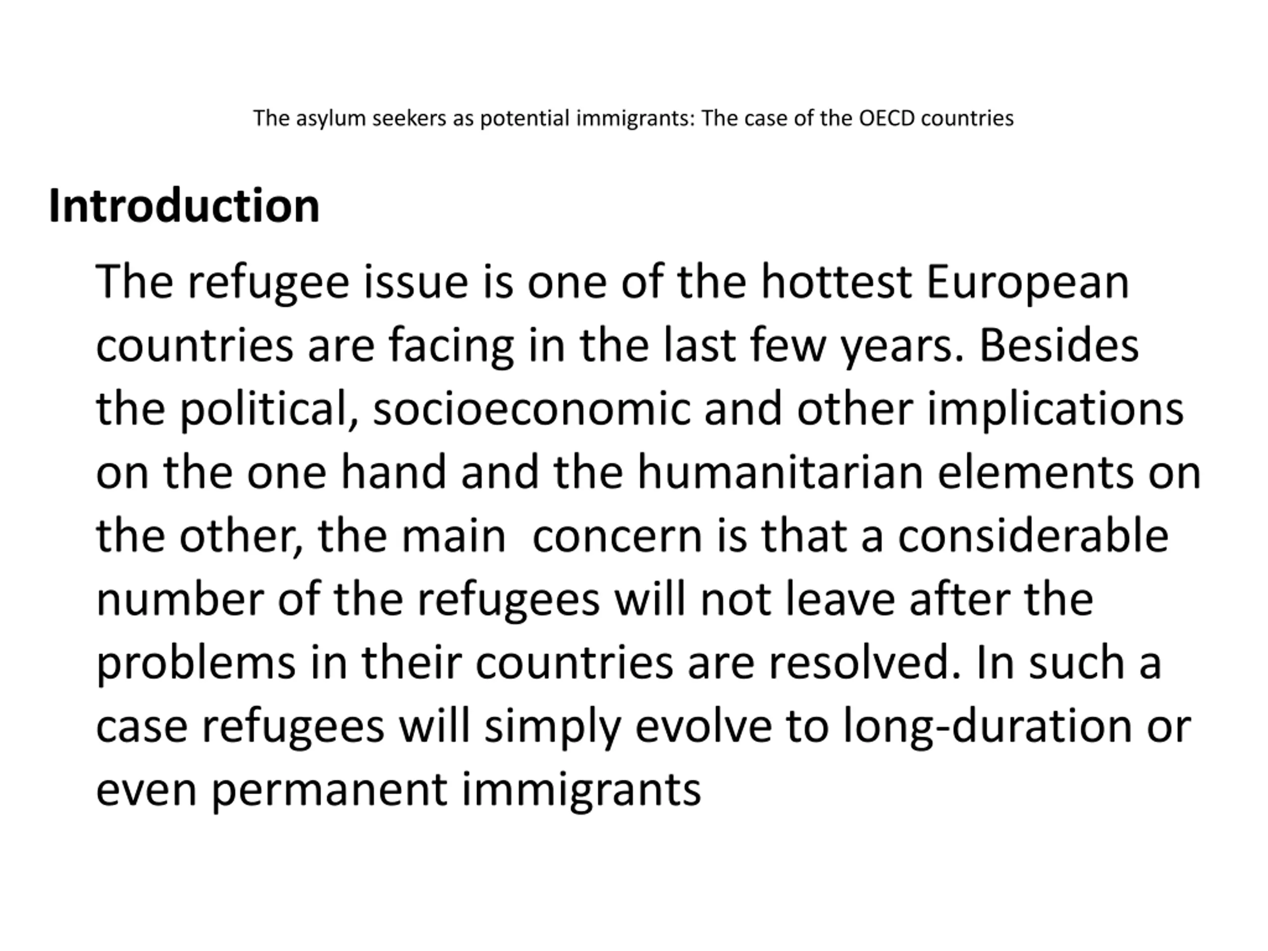 The asylum seekers as potential immigrants: The case of the OECD countries Introduction The refugee issue is one of the hottest European countries are facing in the last few years. Besides the political, socioeconomic and other implications on the one hand and the humanitarian elements on the other, the main concern is that a considerable number of the refugees will not leave after the problems in their countries are resolved. In such a case refugees will simply evolve to long-duration or even permanent immigrants