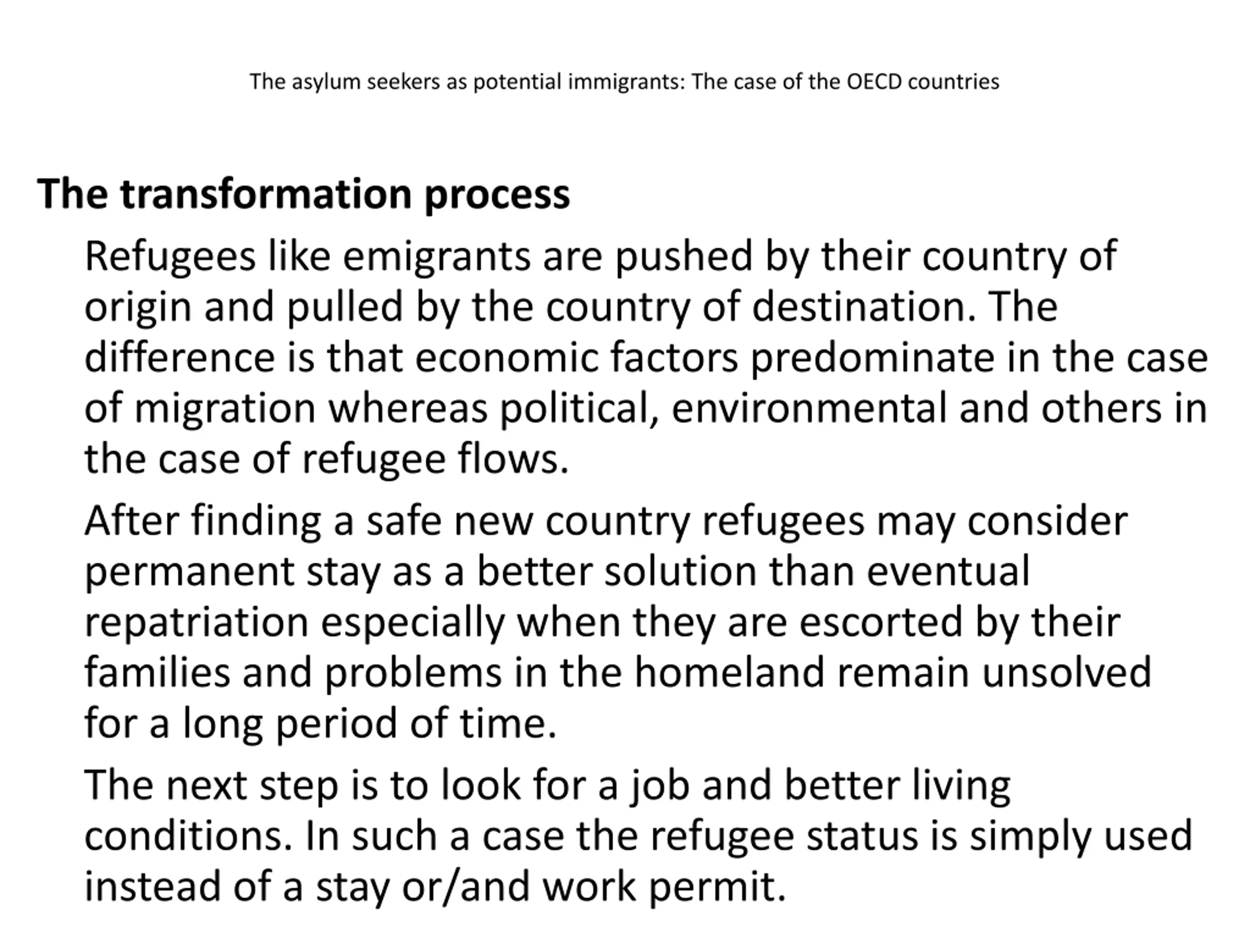 The asylum seekers as potential immigrants: The case of the OECD countries The transformation process Refugees like emigrants are pushed by their country of origin and pulled by the country of destination. The difference is that economic factors predominate in the case of migration whereas political, environmental and others in the case of refugee flows. After finding a safe new country refugees may consider permanent stay as a better solution than eventual repatriation especially when they are escorted by their families and problems in the homeland remain unsolved for a long period of time. The next step is to look for a job and better living conditions. In such a case the refugee status is simply used instead of a stay or/and work permit.