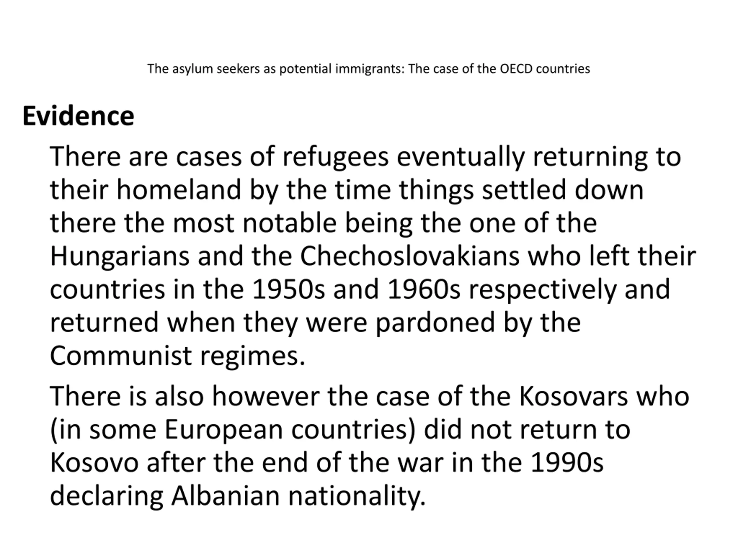 The asylum seekers as potential immigrants: The case of the OECD countries Evidence There are cases of refugees eventually returning to their homeland by the time things settled down there the most notable being the one of the Hungarians and the Chechoslovakians who left their countries in the 1950s and 1960s respectively and returned when they were pardoned by the Communist regimes. There is also however the case of the Kosovars who (in some European countries) did not return to Kosovo after the end of the war in the 1990s declaring Albanian nationality.