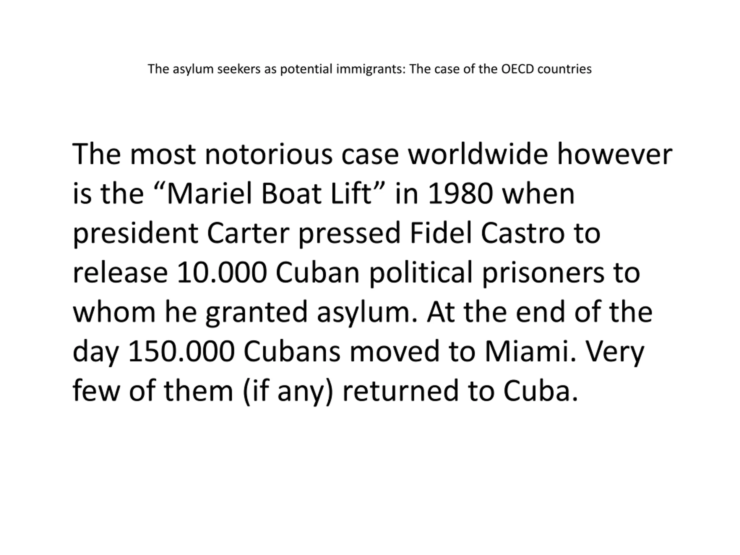 The asylum seekers as potential immigrants: The case of the OECD countries The most notorious case worldwide however is the Mariel Boat Lift in 1980 when president Carter pressed Fidel Castro to release 10.000 Cuban political prisoners to whom he granted asylum. At the end of the day 150.000 Cubans moved to Miami. Very few of them (if any) returned to Cuba.