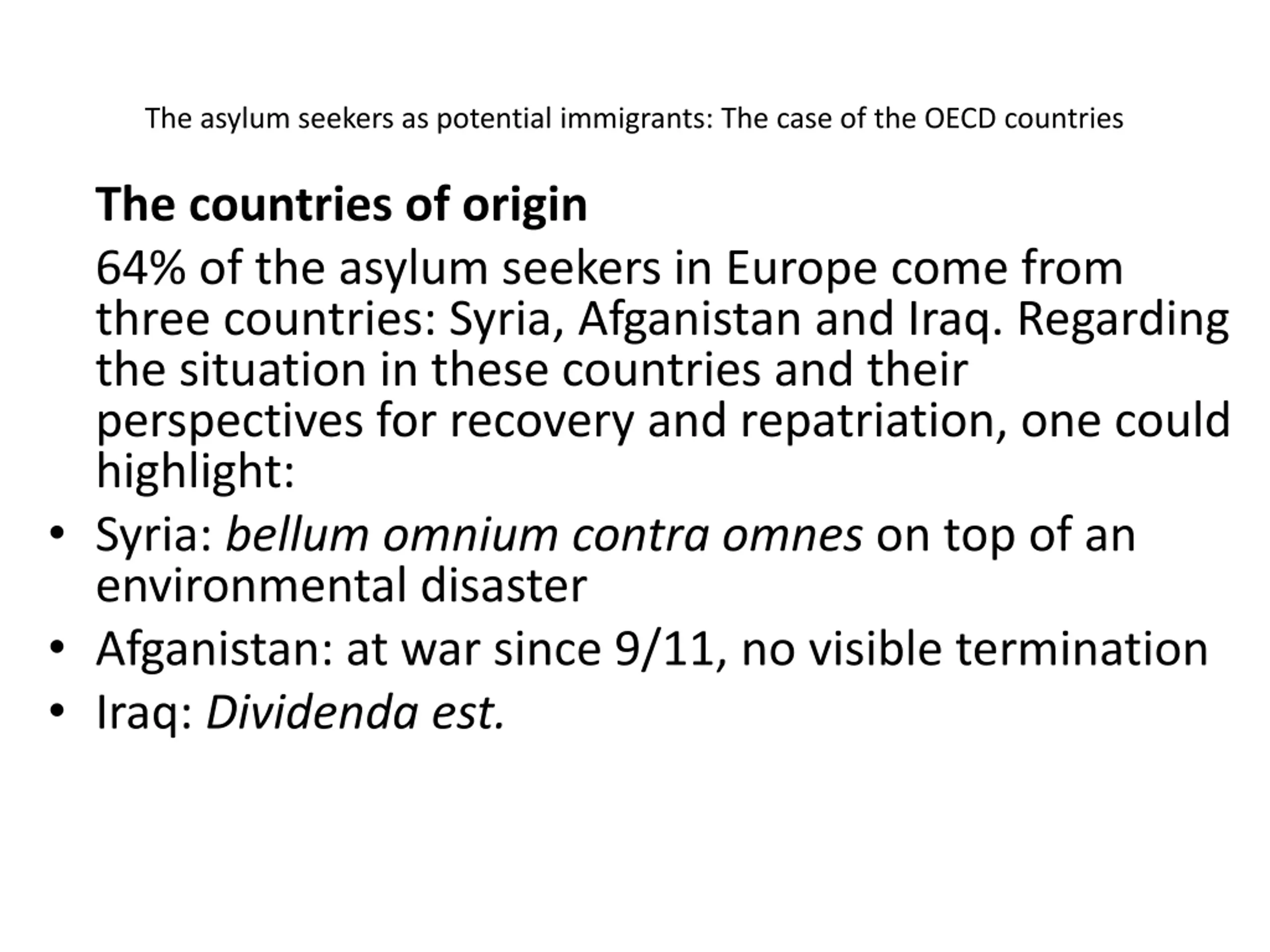 The asylum seekers as potential immigrants: The case of the OECD countries The countries of origin 64% of the asylum seekers in Europe come from three countries: Syria, Afganistan and Iraq. Regarding the situation in these countries and their perspectives for recovery and repatriation, one could highlight: Syria: bellum omnium contra omnes on top of an environmental disaster Afganistan: at war since 9/11, no visible termination Iraq: Dividenda est.